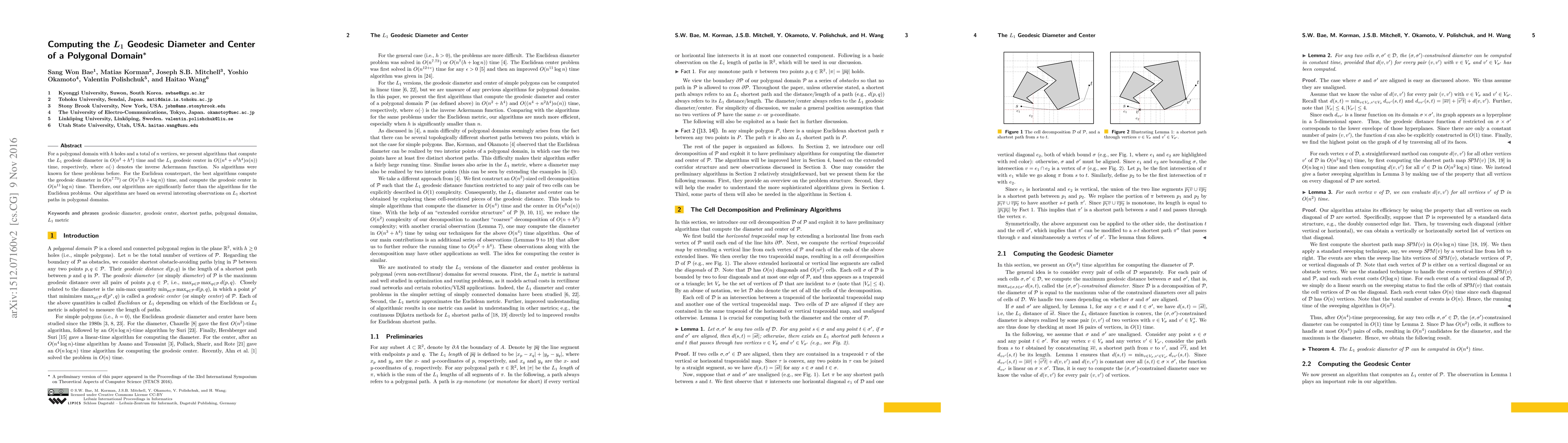 The paper presents algorithms to compute the L1 geodesic diameter and center of a polygonal domain in significantly faster times than previous Euclidean counterparts.