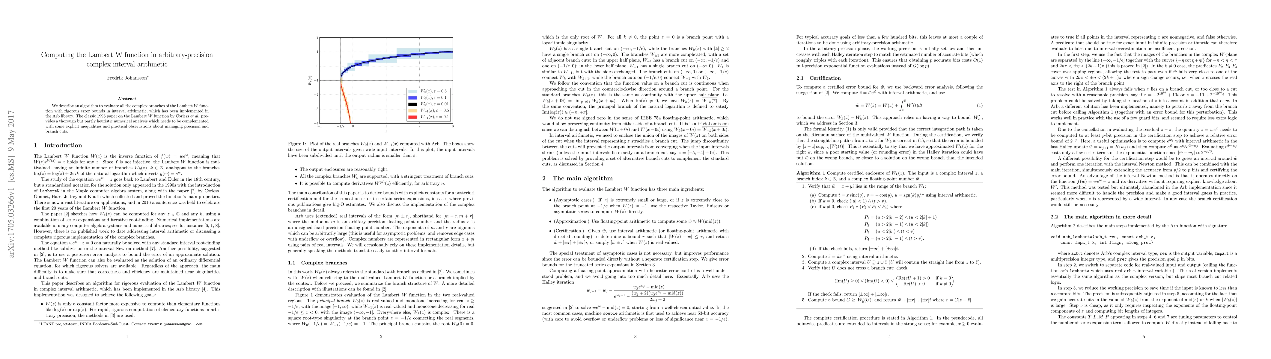 Summary: This paper presents an algorithm for computing the Lambert W function across all complex branches with rigorous error bounds using arbitrary-precision interval arithmetic, implemented in the Arb library, addressing the limitations of the heuristic approach in the 1996 Corless et al. paper.
