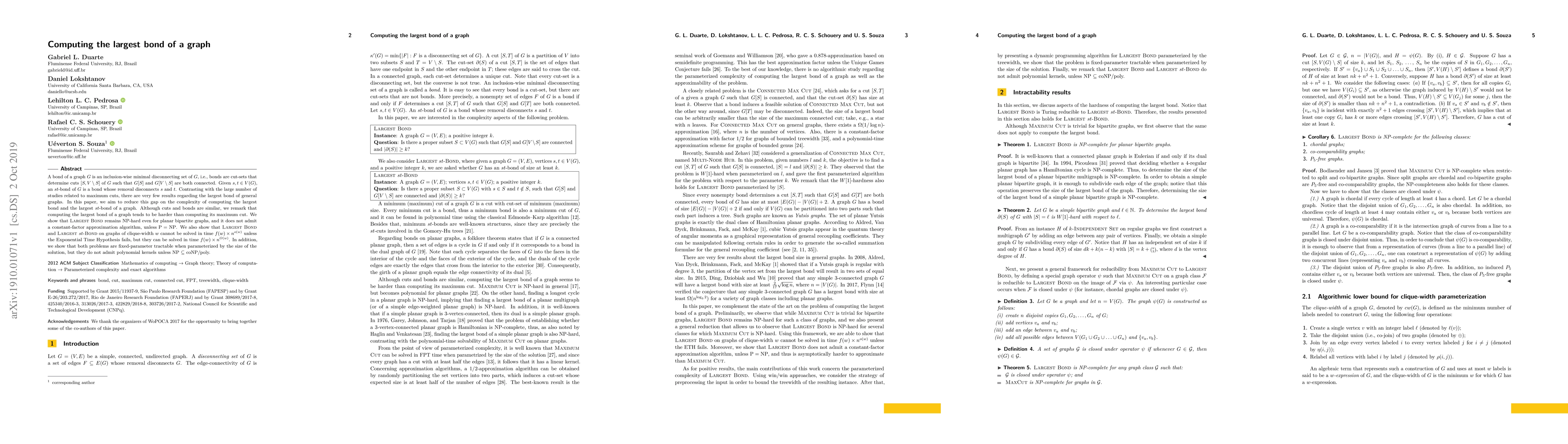 A bond of a graph $G$ is an inclusion-wise minimal disconnecting set of $G$, i.e., bonds are cut-sets that determine cuts $[S,V\setminus S]$ of $G$ such that $G[S]$ and $G[V\setminus S]$ are both connected. Given $s,t\in V(G)$, an $st$-bond of $G$ is a bond whose removal disconnects $s$ and $t$. Contrasting with the large number of studies related to maximum cuts, there are very few results regarding the largest bond of general graphs. In this paper, we aim to reduce this gap on the complexity of computing the largest bond and the largest $st$-bond of a graph. Although cuts and bonds are similar, we remark that computing the largest bond of a graph tends to be harder than computing its maximum cut. We show that {\sc Largest Bond} remains NP-hard even for planar bipartite graphs, and it does not admit a constant-factor approximation algorithm, unless $P = NP$. We also show that {\sc Largest Bond} and {\sc Largest $st$-Bond} on graphs of clique-width $w$ cannot be solved in time $f(w)\times n^{o(w)}$ unless the Exponential Time Hypothesis fails, but they can be solved in time $f(w)\times n^{O(w)}$. In addition, we show that both problems are fixed-parameter tractable when parameterized by the size of the solution, but they do not admit polynomial kernels unless NP $\subseteq$ coNP/poly.