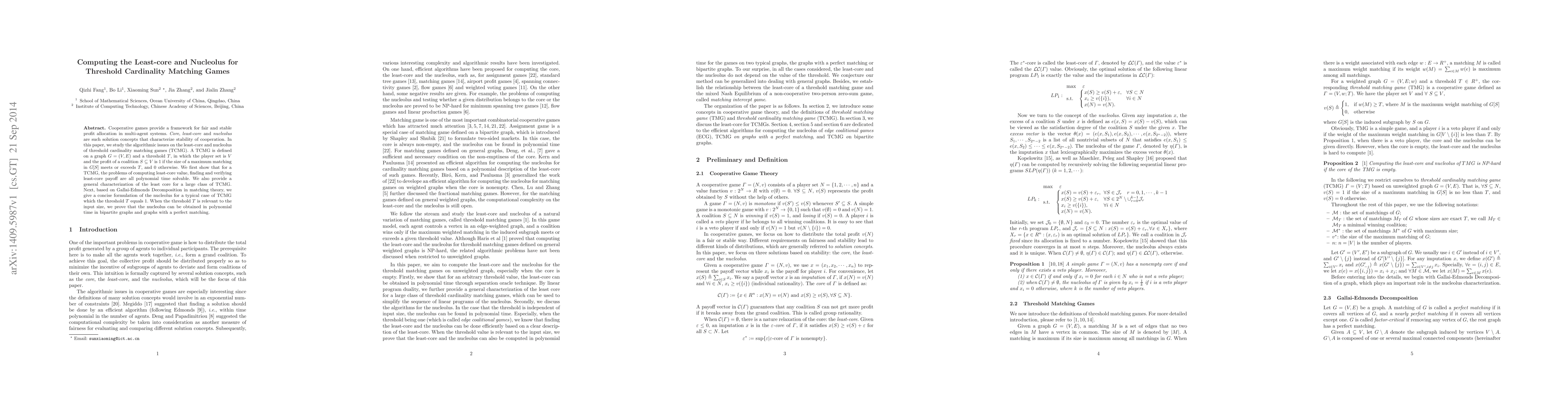 This paper investigates the computational aspects of the least-core and nucleolus in threshold cardinality matching games (TCMG). It demonstrates polynomial time solvability for computing least-core value and finding least-core payoffs, and provides a general characterization of the least core for a broad class of TCMG. Additionally, it presents a formulation for the nucleolus in TCMG with a threshold of 1 and proves polynomial time computation for the nucleolus in bipartite graphs and graphs with perfect matching.