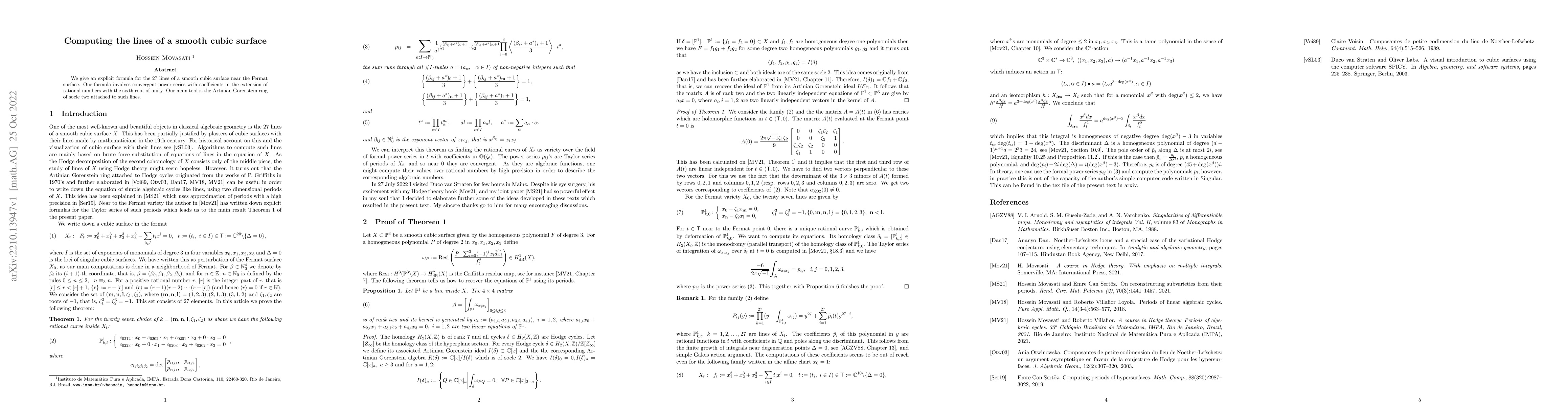 This paper presents an explicit formula for the 27 lines on a smooth cubic surface, specifically near the Fermat surface, using power series coefficients from a number field that includes the sixth root of unity, and employs the Artinian Gorenstein ring of socle two as a key mathematical tool.