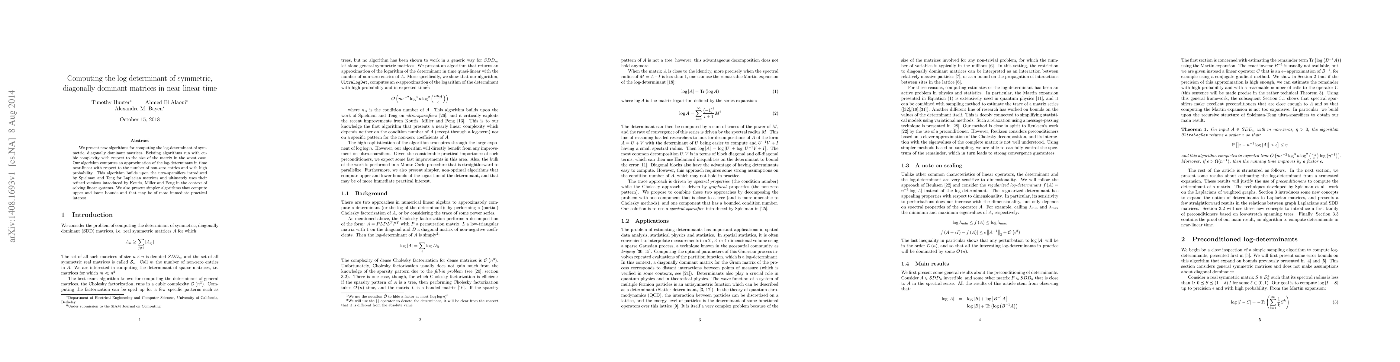 This paper introduces new algorithms for computing the log-determinant of symmetric, diagonally dominant matrices with near-linear time complexity relative to non-zero entries, improving upon existing cubic algorithms. The approach leverages ultra-sparsifiers and refined versions for efficient computation.