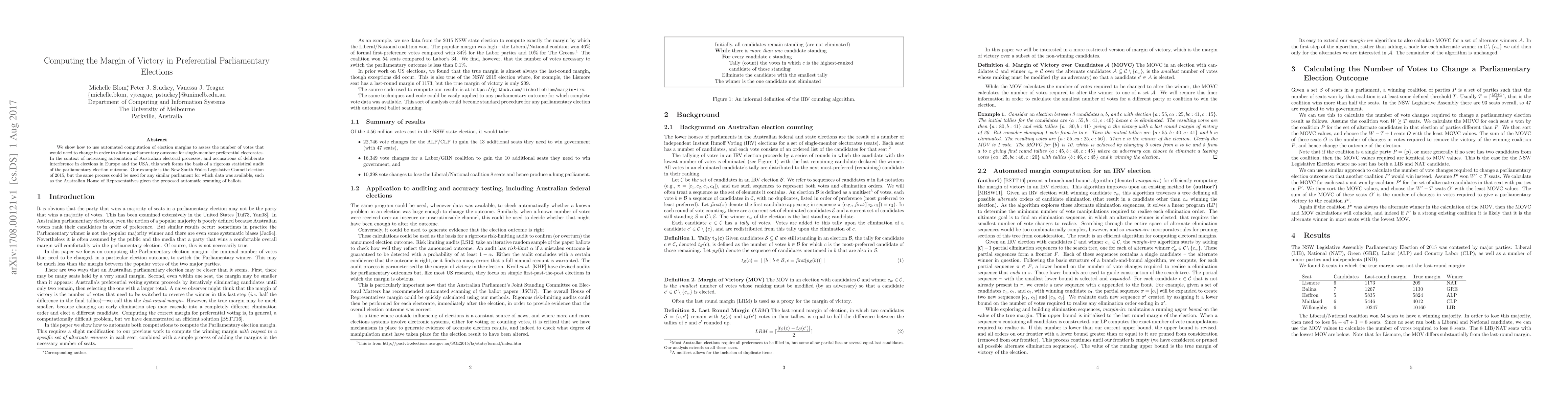 We show how to use automated computation of election margins to assess the number of votes that would need to change in order to alter a parliamentary outcome for single-member preferential electorates. In the context of increasing automation of Australian electoral processes, and accusations of deliberate interference in elections in Europe and the USA, this work forms the basis of a rigorous statistical audit of the parliamentary election outcome. Our example is the New South Wales Legislative Council election of 2015, but the same process could be used for any similar parliament for which data was available, such as the Australian House of Representatives given the proposed automatic scanning of ballots.