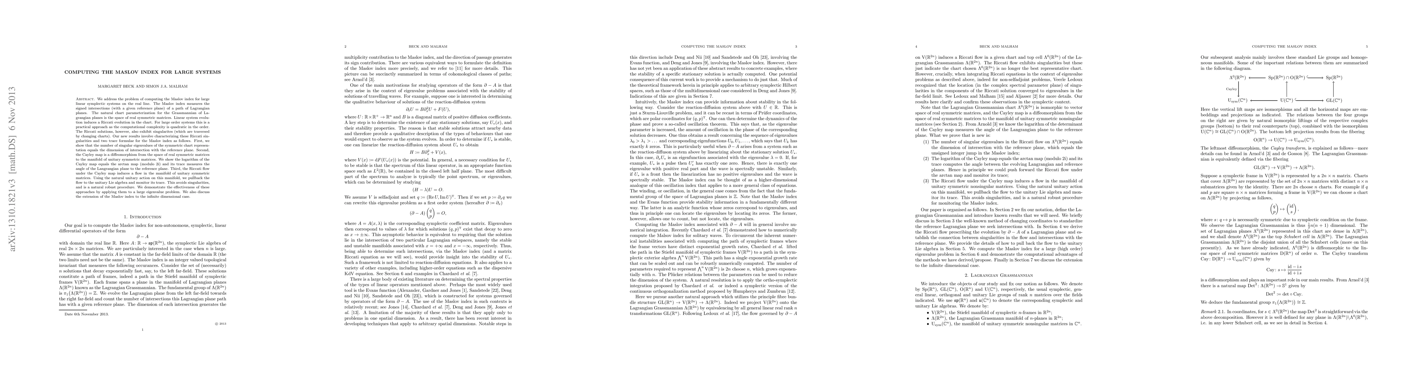 This paper presents a method for computing the Maslov index in large linear symplectic systems by characterizing Riccati singularities and introducing trace formulae. It leverages the Cayley map to transform symmetric matrices into unitary matrices, avoiding singularities and enabling robust computation.