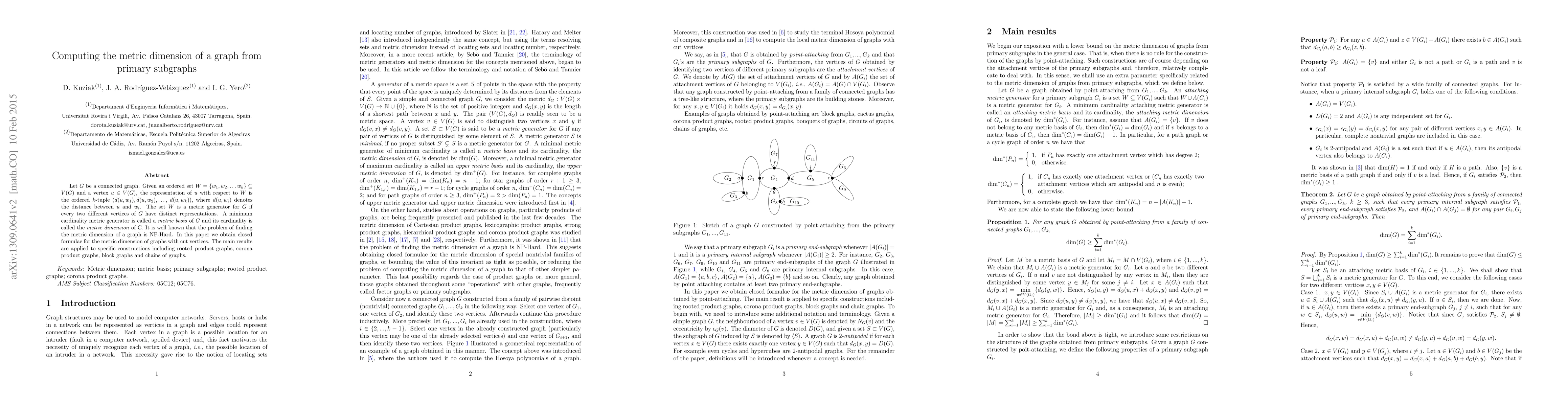 Let $G$ be a connected graph. Given an ordered set $W = \{w_1, w_2,\dots w_k\}\subseteq V(G)$ and a vertex $u\in V(G)$, the representation of $u$ with respect to $W$ is the ordered $k$-tuple $(d(u,w_1), d(u,w_2),\dots,$ $d(u,w_k))$, where $d(u,w_i)$ denotes the distance between $u$ and $w_i$. The set $W$ is a metric generator for $G$ if every two different vertices of $G$ have distinct representations. A minimum cardinality metric generator is called a \emph{metric basis} of $G$ and its cardinality is called the \emph{metric dimension} of G. It is well known that the problem of finding the metric dimension of a graph is NP-Hard. In this paper we obtain closed formulae for the metric dimension of graphs with cut vertices. The main results are applied to specific constructions including rooted product graphs, corona product graphs, block graphs and chains of graphs.