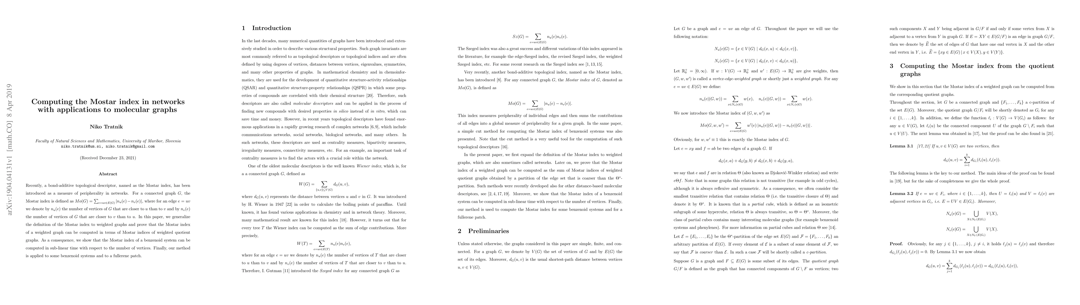 This paper generalizes the Mostar index for measuring peripherality in networks to weighted graphs and demonstrates its computation via weighted quotient graphs. The method enables sub-linear time computation of the Mostar index for benzenoid systems and is applied to molecular graphs like benzenoid systems and fullerene patches.