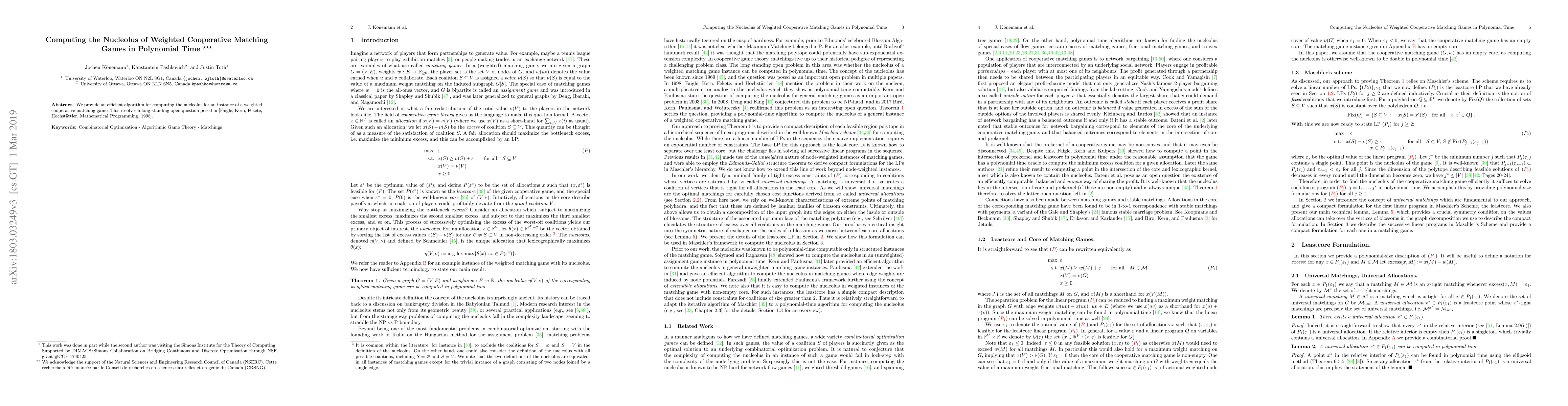Summary: An efficient algorithm is presented to compute the nucleolus for weighted cooperative matching games, resolving a long-standing open question from Faigle et al. (1998). This advancement provides a polynomial-time solution to a previously unresolved problem.