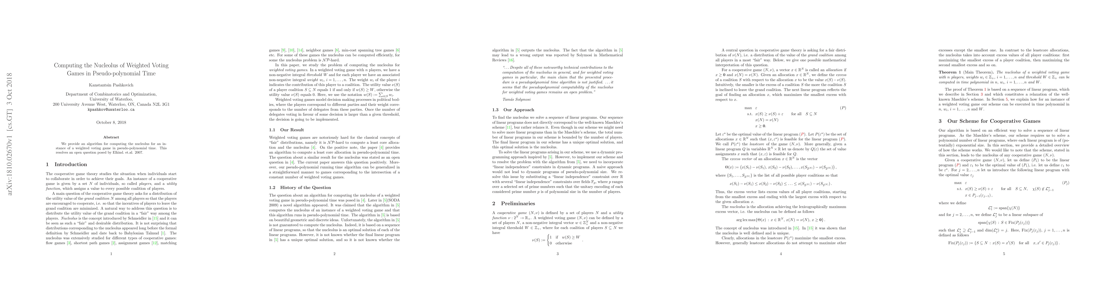 Summary: This paper presents an algorithm to compute the nucleolus for weighted voting games in pseudo-polynomial time, addressing an open question from Elkind et al. (2007) and offering a solution to the problem.