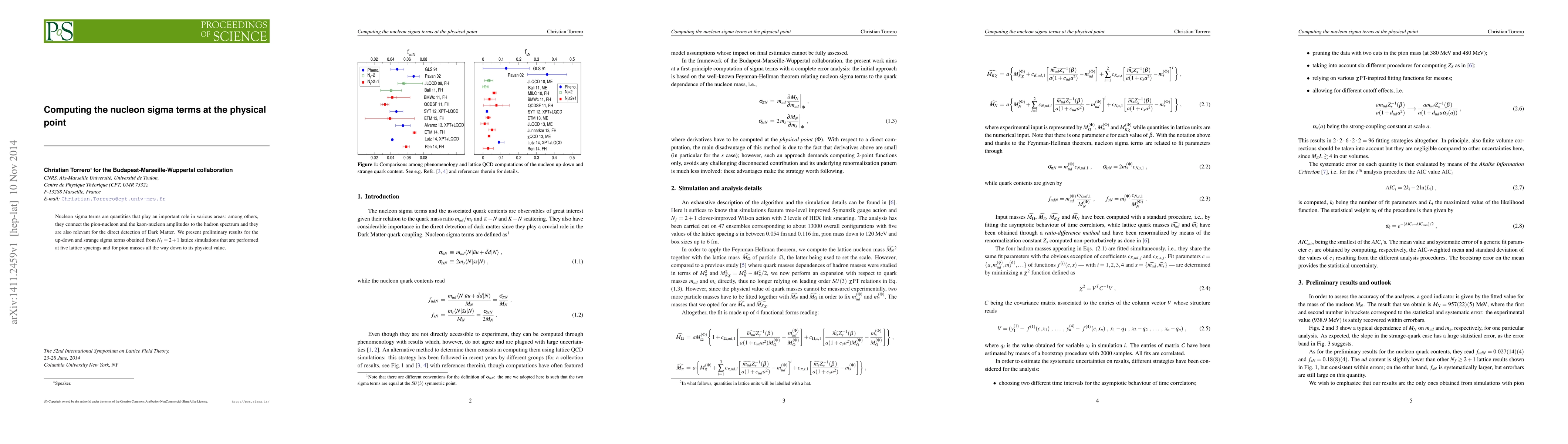 Nucleon sigma terms are quantities that play an important role in various areas: among others, they connect the pion-nucleon and the kaon-nucleon amplitudes to the hadron spectrum and they are also relevant for the direct detection of Dark Matter. We present preliminary results for the up-down and strange sigma terms obtained from $N_f=2+1$ lattice simulations that are performed at five lattice spacings and for pion masses all the way down to its physical value.