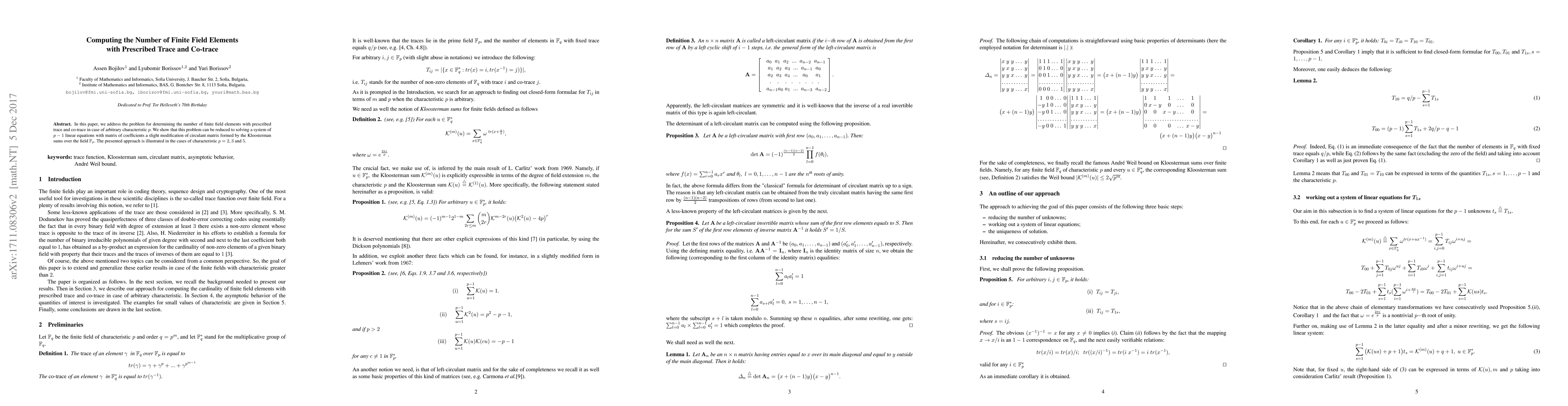This paper enumerates finite field elements with specified trace and co-trace by reducing the problem to solving a system of linear equations using a modified circulant matrix based on Kloosterman sums. The method is demonstrated for characteristics $p = 2, 3,$ and $5$.