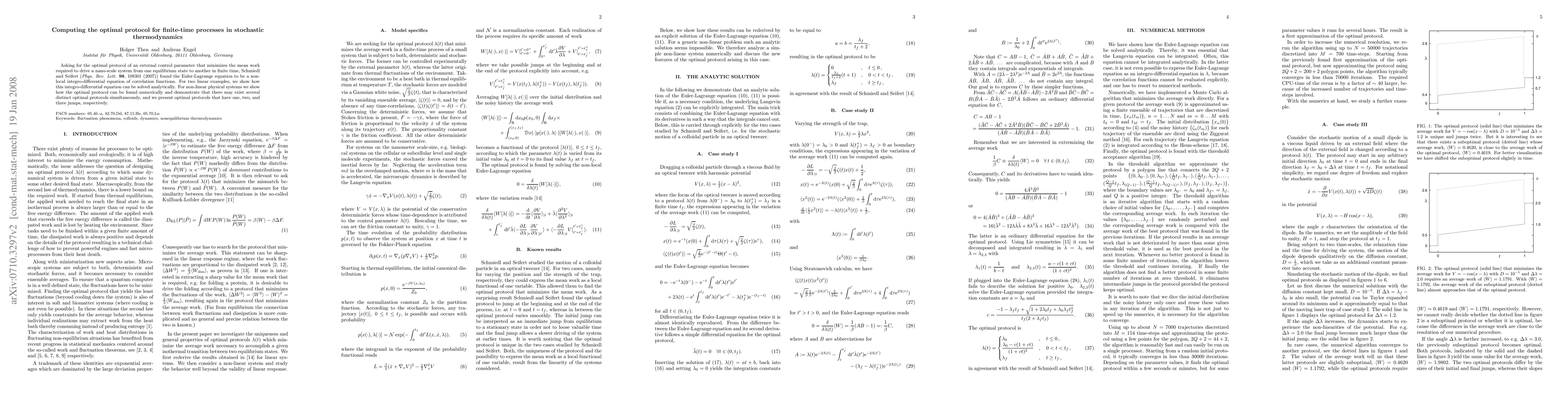 Asking for the optimal protocol of an external control parameter that minimizes the mean work required to drive a nano-scale system from one equilibrium state to another in finite time, Schmiedl and Seifert ({\it Phys. Rev. Lett.} {\bf 98}, 108301 (2007)) found the Euler-Lagrange equation to be a non-local integro-differential equation of correlation functions. For two linear examples, we show how this integro-differential equation can be solved analytically. For non-linear physical systems we show how the optimal protocol can be found numerically and demonstrate that there may exist several distinct optimal protocols simultaneously, and we present optimal protocols that have one, two, and three jumps, respectively.