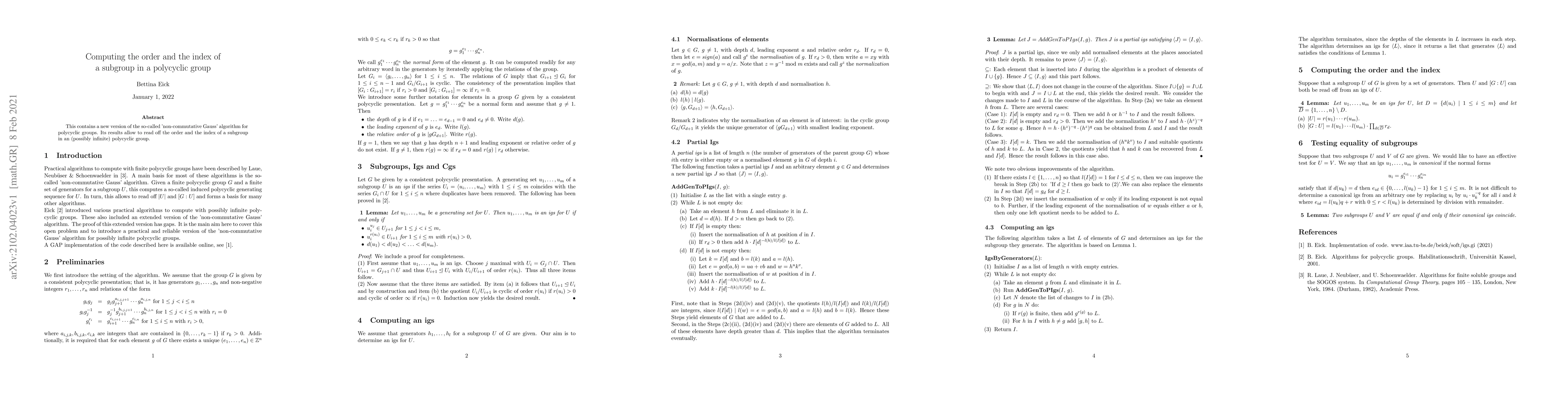 This contains a new version of the so-called non-commutative Gauss algorithm for polycyclic groups. Its results allow to read off the order and the index of a subgroup in an (possibly infinite) polycyclic group.