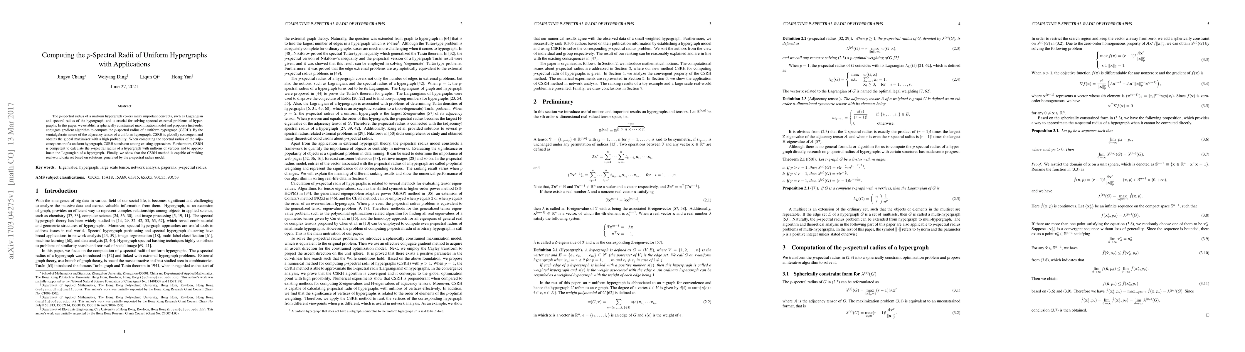 The $p$-spectral radius of a uniform hypergraph covers many important concepts, such as Lagrangian and spectral radius of the hypergraph, and is crucial for solving spectral extremal problems of hypergraphs. In this paper, we establish a spherically constrained maximization model and propose a first-order conjugate gradient algorithm to compute the $p$-spectral radius of a uniform hypergraph (CSRH). By the semialgebraic nature of the adjacency tensor of a uniform hypergraph, CSRH is globally convergent and obtains the global maximizer with a high probability. When computing the spectral radius of the adjacency tensor of a uniform hypergraph, CSRH stands out among existing approaches. Furthermore, CSRH is competent to calculate the $p$-spectral radius of a hypergraph with millions of vertices and to approximate the Lagrangian of a hypergraph. Finally, we show that the CSRH method is capable of ranking real-world data set based on solutions generated by the $p$-spectral radius model.