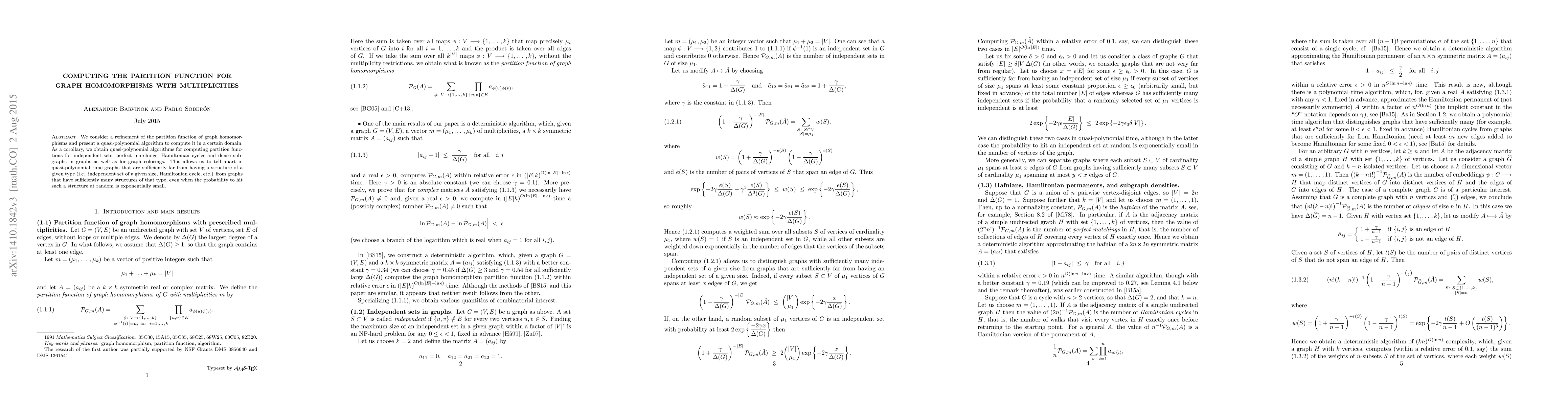 This paper presents a quasi-polynomial algorithm for computing the refined partition function of graph homomorphisms with multiplicities, leading to quasi-polynomial time solutions for various combinatorial structures like independent sets, perfect matchings, and Hamiltonian cycles. It distinguishes graphs with exponentially small structures from those with many such structures.