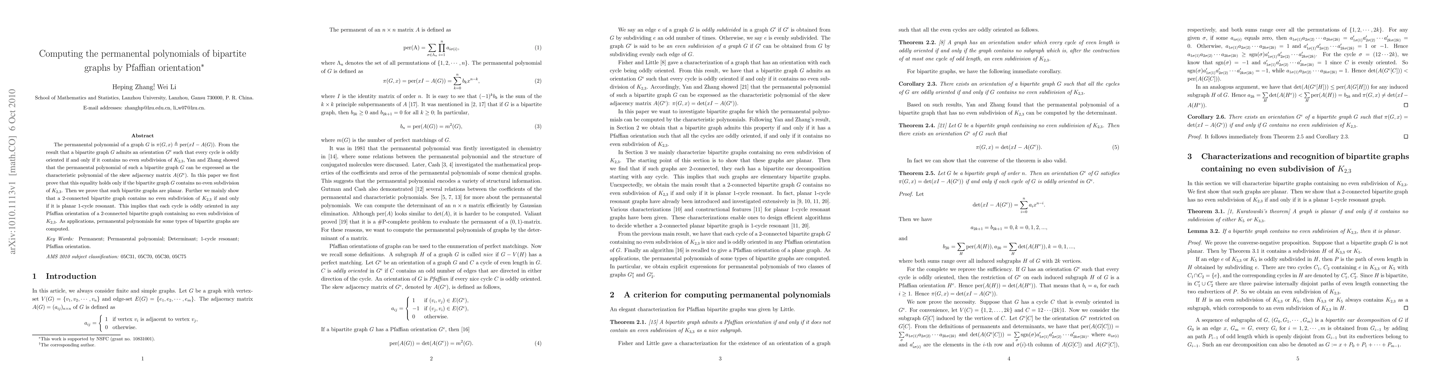 The permanental polynomial of a graph $G$ is $\pi(G,x)\triangleq\mathrm{per}(xI-A(G))$. From the result that a bipartite graph $G$ admits an orientation $G^e$ such that every cycle is oddly oriented if and only if it contains no even subdivision of $K_{2,3}$, Yan and Zhang showed that the permanental polynomial of such a bipartite graph $G$ can be expressed as the characteristic polynomial of the skew adjacency matrix $A(G^e)$. In this paper we first prove that this equality holds only if the bipartite graph $G$ contains no even subdivision of $K_{2,3}$. Then we prove that such bipartite graphs are planar. Further we mainly show that a 2-connected bipartite graph contains no even subdivision of $K_{2,3}$ if and only if it is planar 1-cycle resonant. This implies that each cycle is oddly oriented in any Pfaffian orientation of a 2-connected bipartite graph containing no even subdivision of $K_{2,3}$. As applications, permanental polynomials for some types of bipartite graphs are computed.