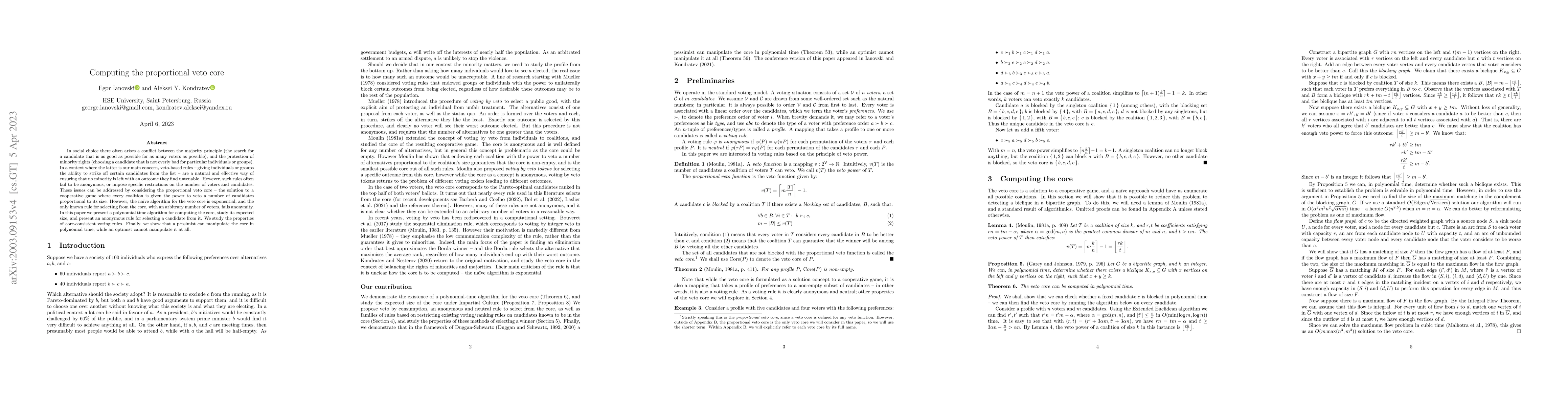 This paper presents a polynomial time algorithm for computing the proportional veto core in social choice, addressing anonymity and size issues. It also introduces an anonymous rule for candidate selection from the core and explores the manipulability of the core by different strategies.
