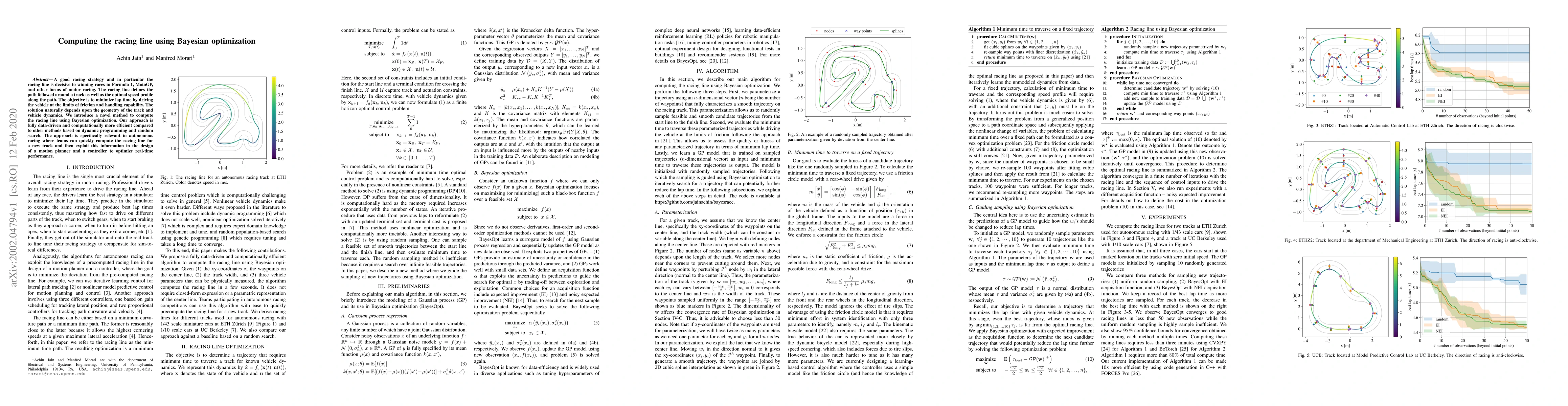A good racing strategy and in particular the racing line is decisive to winning races in Formula 1, MotoGP, and other forms of motor racing. The racing line defines the path followed around a track as well as the optimal speed profile along the path. The objective is to minimize lap time by driving the vehicle at the limits of friction and handling capability. The solution naturally depends upon the geometry of the track and vehicle dynamics. We introduce a novel method to compute the racing line using Bayesian optimization. Our approach is fully data-driven and computationally more efficient compared to other methods based on dynamic programming and random search. The approach is specifically relevant in autonomous racing where teams can quickly compute the racing line for a new track and then exploit this information in the design of a motion planner and a controller to optimize real-time performance.