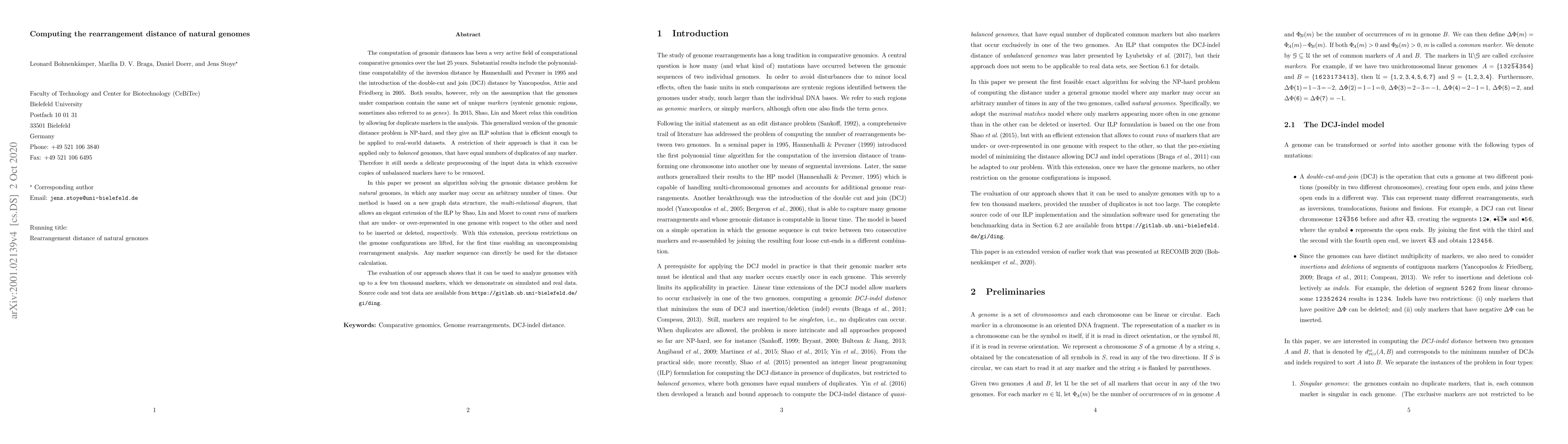 The computation of genomic distances has been a very active field of computational comparative genomics over the last 25 years. Substantial results include the polynomial-time computability of the inversion distance by Hannenhalli and Pevzner in 1995 and the introduction of the double-cut and join (DCJ) distance by Yancopoulos et al. in 2005. Both results, however, rely on the assumption that the genomes under comparison contain the same set of unique markers (syntenic genomic regions, sometimes also referred to as genes). In 2015, Shao, Lin and Moret relax this condition by allowing for duplicate markers in the analysis. This generalized version of the genomic distance problem is NP-hard, and they give an ILP solution that is efficient enough to be applied to real-world datasets. A restriction of their approach is that it can be applied only to balanced genomes, that have equal numbers of duplicates of any marker. Therefore it still needs a delicate preprocessing of the input data in which excessive copies of unbalanced markers have to be removed. In this paper we present an algorithm solving the genomic distance problem for natural genomes, in which any marker may occur an arbitrary number of times. Our method is based on a new graph data structure, the multi-relational diagram, that allows an elegant extension of the ILP by Shao, Lin and Moret to count runs of markers that are under- or over-represented in one genome with respect to the other and need to be inserted or deleted, respectively. With this extension, previous restrictions on the genome configurations are lifted, for the first time enabling an uncompromising rearrangement analysis. Any marker sequence can directly be used for the distance calculation. The evaluation of our approach shows that it can be used to analyze genomes with up to a few ten thousand markers, which we demonstrate on simulated and real data.