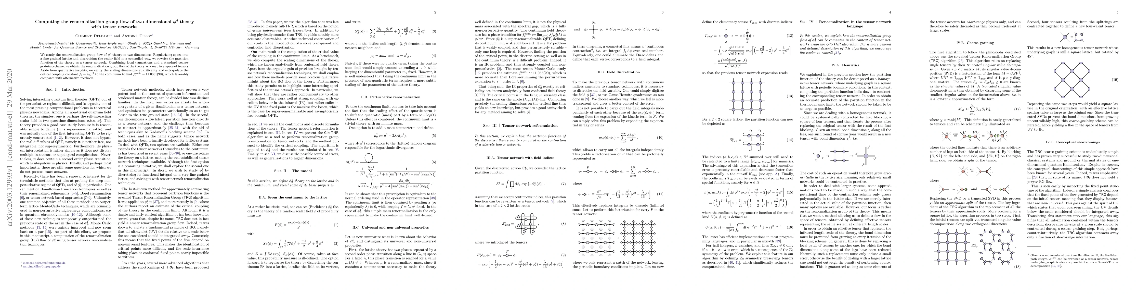 This paper computes the renormalization group flow of two-dimensional $\phi^4$ theory using tensor networks, finding the critical coupling constant $f^{\rm cont.}_{\rm c} = 11.0861(90)$ and verifying scaling dimensions at criticality. The method combines local truncations and coarse-graining on a lattice.