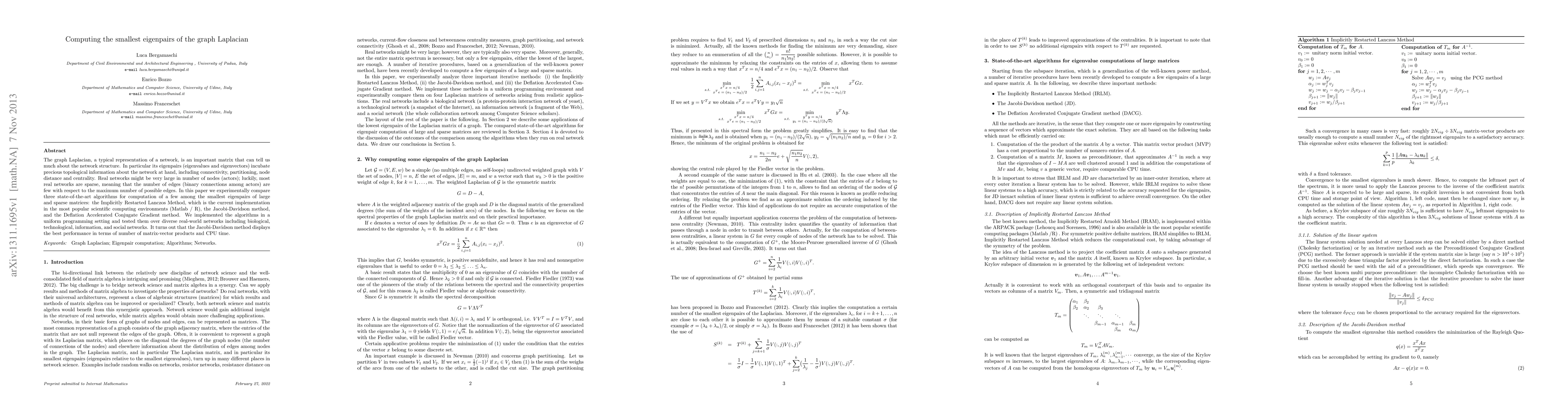 This paper compares three algorithms for computing the smallest eigenpairs of large, sparse graph Laplacian matrices, finding that the Jacobi-Davidson method outperforms the others in terms of efficiency and performance. The study tests the algorithms on various real-world networks.