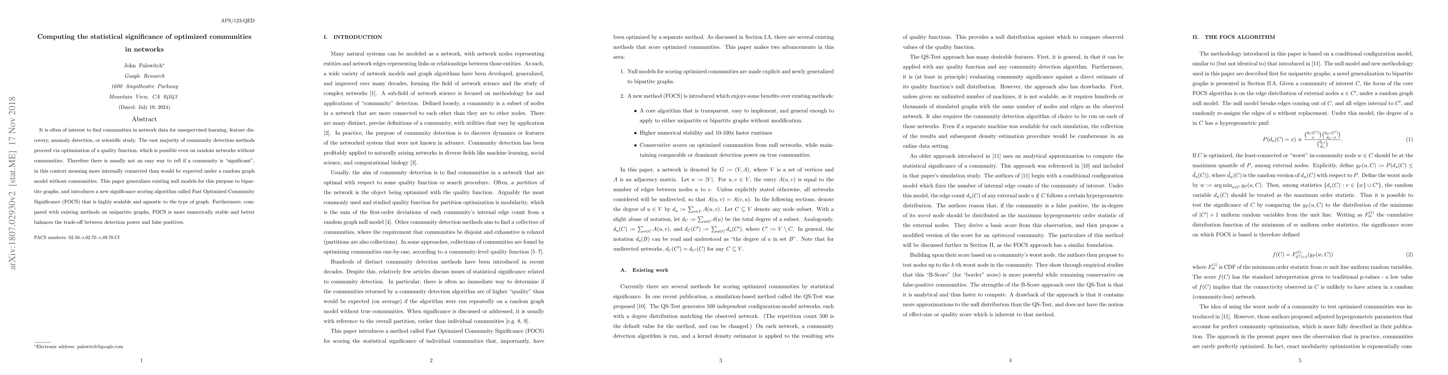 This paper introduces the Fast Optimized Community Significance (FOCS) algorithm for assessing the statistical significance of optimized communities in both unipartite and bipartite networks. FOCS is scalable, adaptable to various graph types, and offers improved numerical stability and balance between detection power and false positives compared to existing methods.