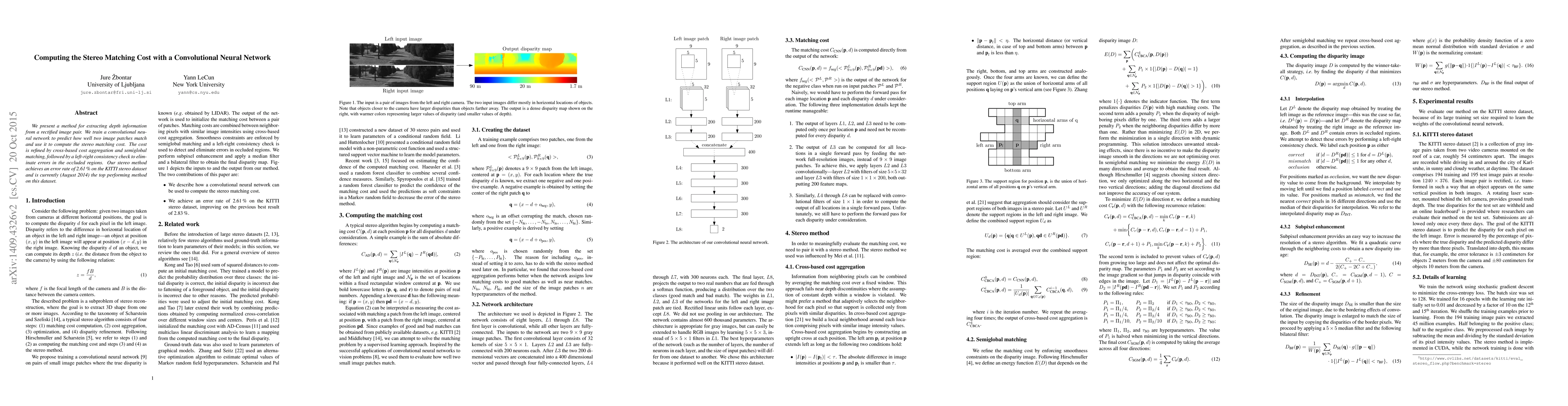 This paper proposes a convolutional neural network to compute stereo matching costs for depth extraction from rectified image pairs, refining the cost through cross-based aggregation and semiglobal matching, and achieving a top-performing error rate of 2.61% on the KITTI dataset.