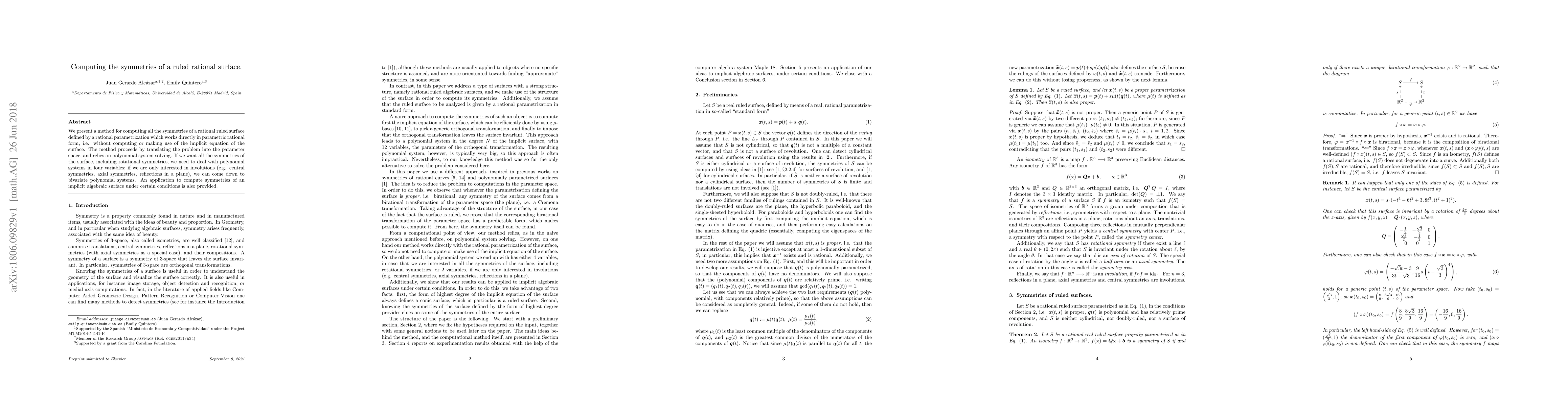 This paper introduces a method for computing symmetries of rational ruled surfaces directly from their parametric form, utilizing polynomial system solving to identify symmetries including rotations and involutions. It addresses polynomial systems in four variables for full symmetries and bivariate systems for specific involutions.