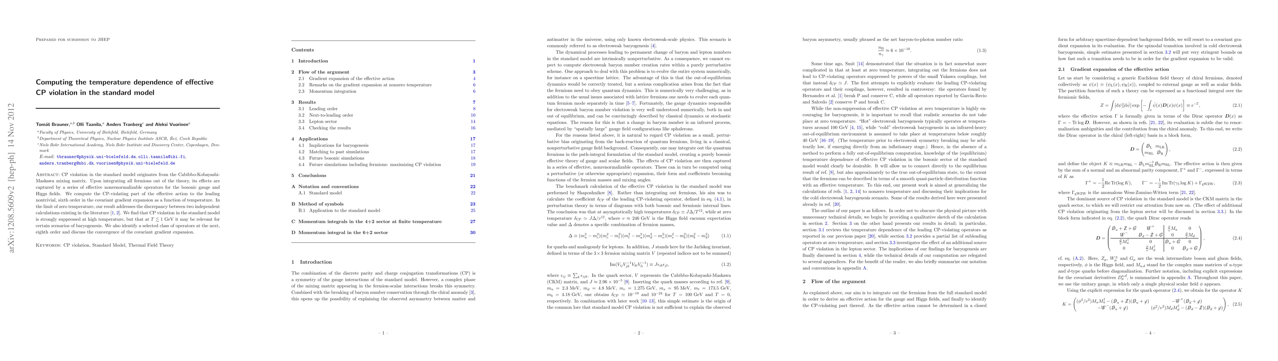 CP violation in the standard model originates from the Cabibbo-Kobayashi-Maskawa mixing matrix. Upon integrating all fermions out of the theory, its effects are captured by a series of effective nonrenormalizable operators for the bosonic gauge and Higgs fields. We compute the CP-violating part of the effective action to the leading nontrivial, sixth order in the covariant gradient expansion as a function of temperature. In the limit of zero temperature, our result addresses the discrepancy between two independent calculations existing in the literature [1,2]. We find that CP violation in the standard model is strongly suppressed at high temperature, but that at T<1GeV it may be relevant for certain scenarios of baryogenesis. We also identify a selected class of operators at the next, eighth order and discuss the convergence of the covariant gradient expansion.