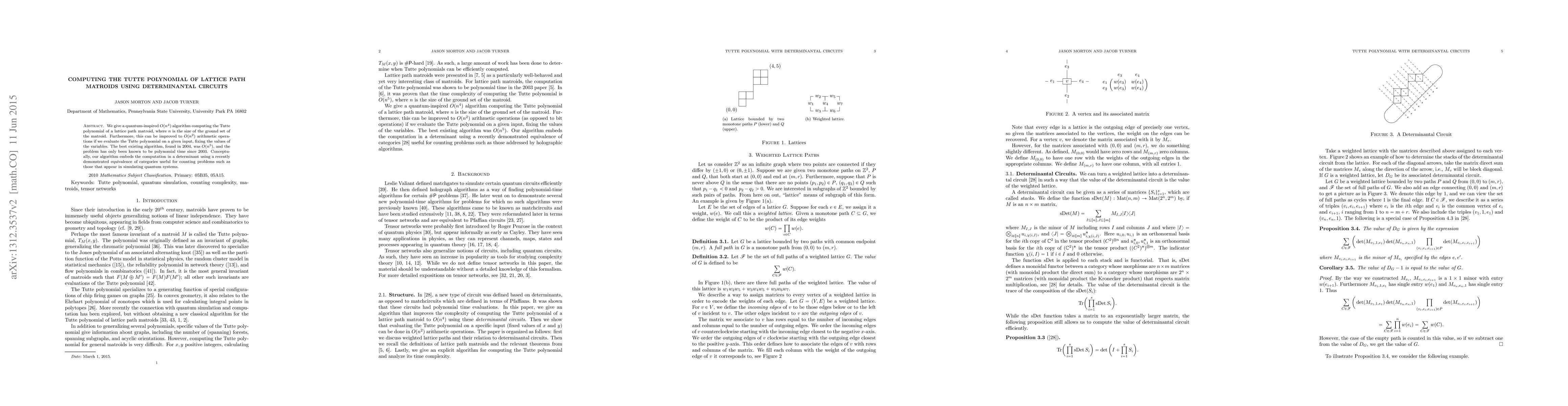 We give a quantum-inspired $O(n^4)$ algorithm computing the Tutte polynomial of a lattice path matroid, where $n$ is the size of the ground set of the matroid. Furthermore, this can be improved to $O(n^2)$ arithmetic operations if we evaluate the Tutte polynomial on a given input, fixing the values of the variables. The best existing algorithm, found in 2004, was $O(n^5)$, and the problem has only been known to be polynomial time since 2003. Conceptually, our algorithm embeds the computation in a determinant using a recently demonstrated equivalence of categories useful for counting problems such as those that appear in simulating quantum systems.