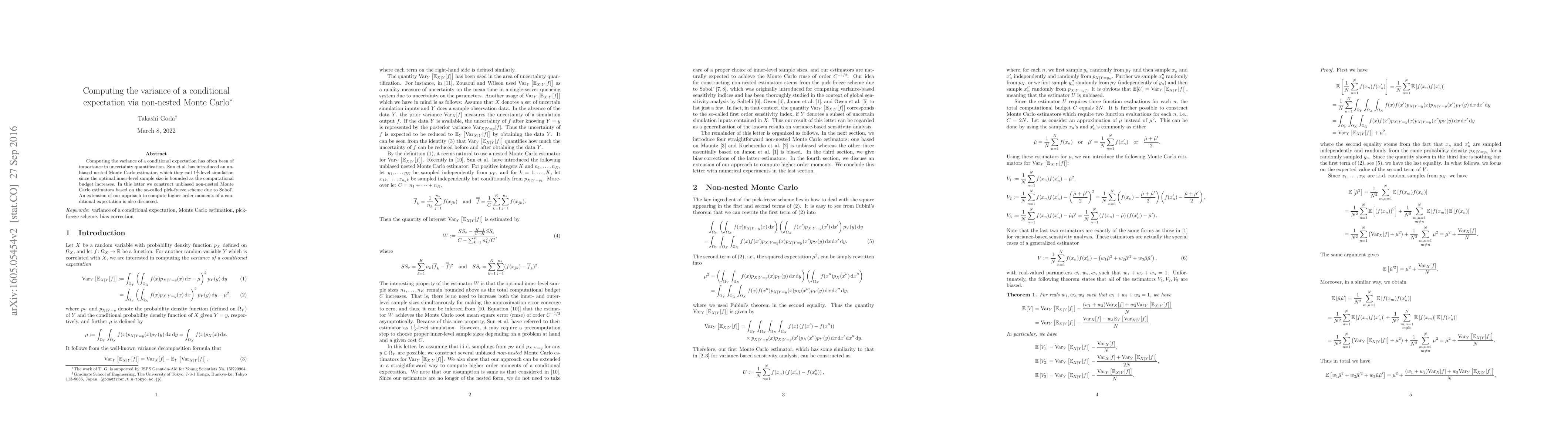 Computing the variance of a conditional expectation has often been of importance in uncertainty quantification. Sun et al. has introduced an unbiased nested Monte Carlo estimator, which they call $1\frac{1}{2}$-level simulation since the optimal inner-level sample size is bounded as the computational budget increases. In this letter we construct unbiased non-nested Monte Carlo estimators based on the so-called pick-freeze scheme due to Sobol'. An extension of our approach to compute higher order moments of a conditional expectation is also discussed.