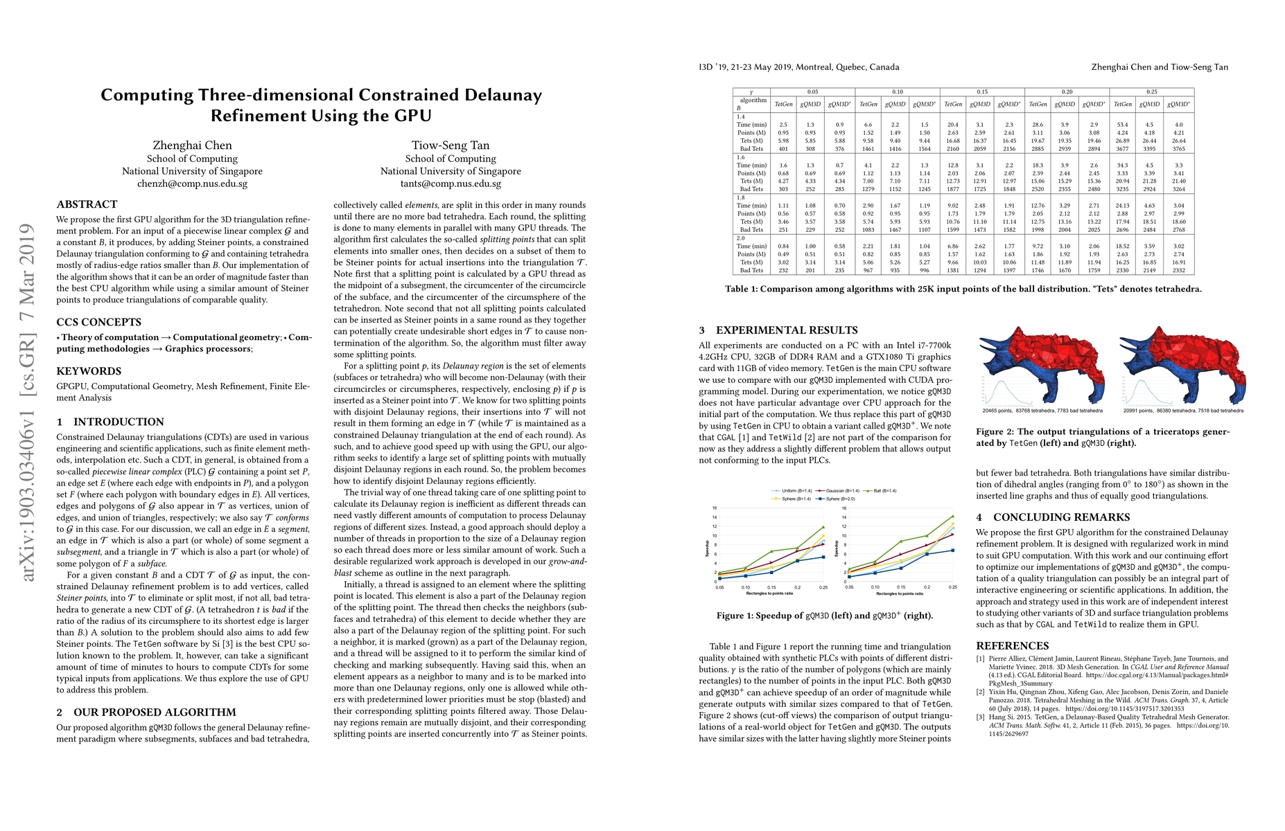 This paper introduces a GPU algorithm for 3D constrained Delaunay refinement, which can produce high-quality triangulations faster than existing CPU algorithms using similar amounts of computational resources.