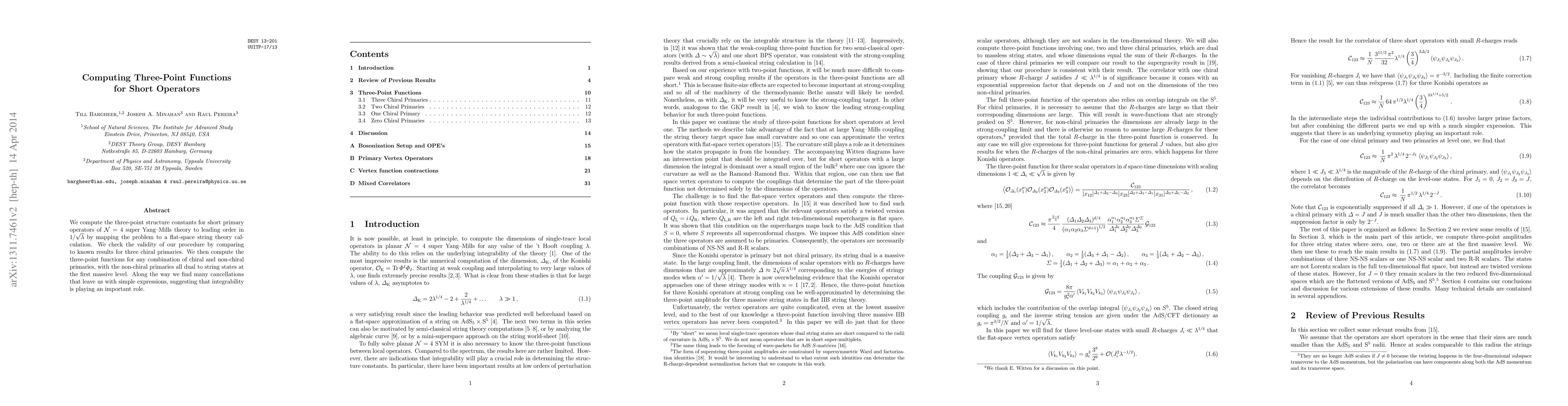 This paper computes three-point structure constants for short primary operators in N=4 super Yang-Mills theory, using a flat-space string theory approach. The results are validated by comparing with known three-chiral primary functions and reveal significant cancellations, indicating the influence of integrability.