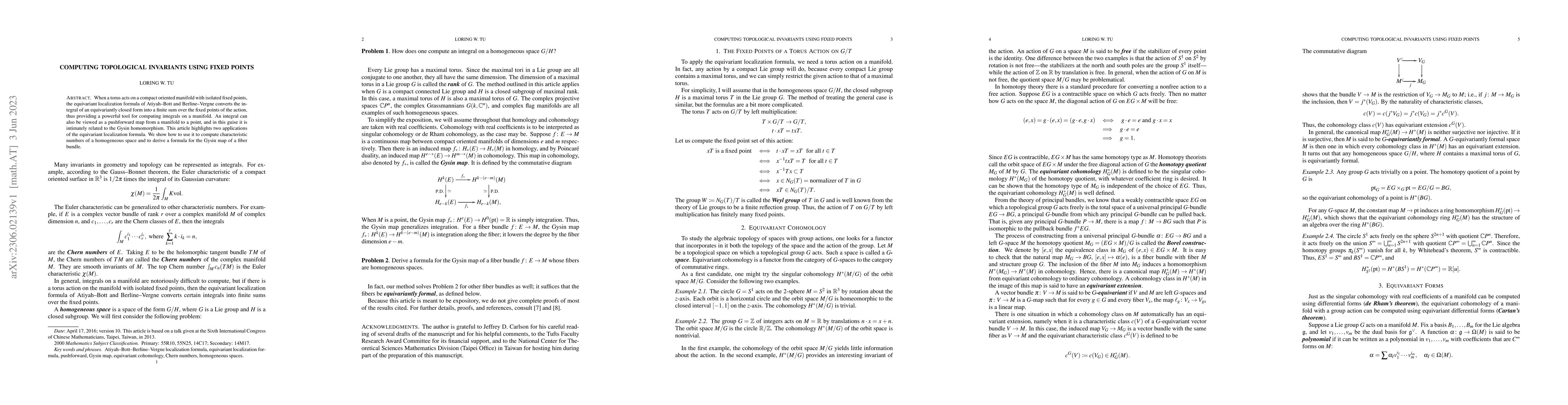 This paper utilizes the equivariant localization formula to compute topological invariants by focusing on fixed points of a torus action on a manifold. It applies this method to determine characteristic numbers of homogeneous spaces and to derive the Gysin map for fiber bundles.