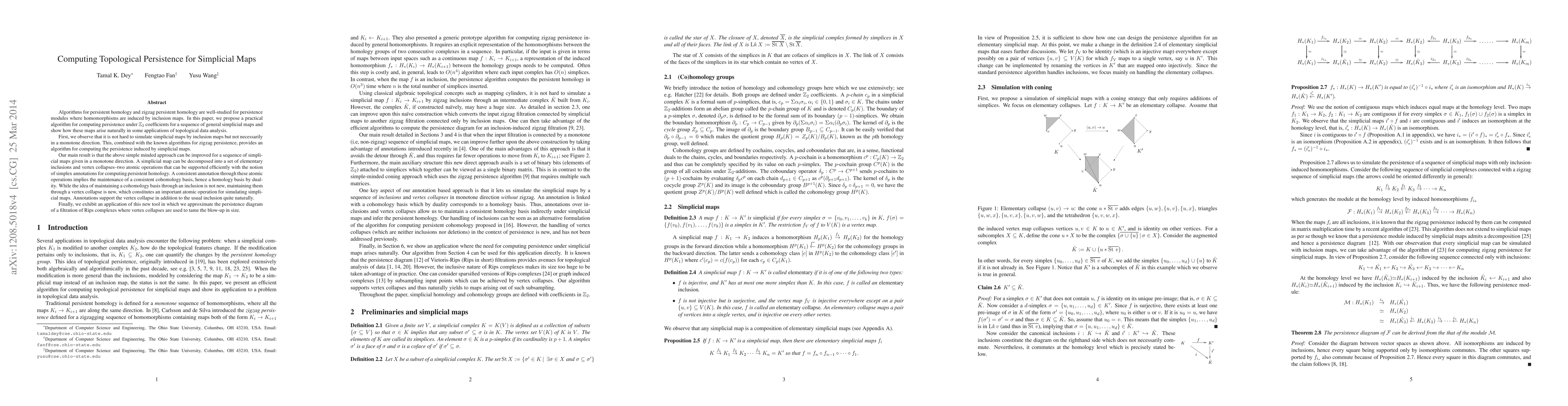 Algorithms for persistent homology and zigzag persistent homology are well-studied for persistence modules where homomorphisms are induced by inclusion maps. In this paper, we propose a practical algorithm for computing persistence under $\mathbb{Z}_2$ coefficients for a sequence of general simplicial maps and show how these maps arise naturally in some applications of topological data analysis. First, we observe that it is not hard to simulate simplicial maps by inclusion maps but not necessarily in a monotone direction. This, combined with the known algorithms for zigzag persistence, provides an algorithm for computing the persistence induced by simplicial maps. Our main result is that the above simple minded approach can be improved for a sequence of simplicial maps given in a monotone direction. A simplicial map can be decomposed into a set of elementary inclusions and vertex collapses--two atomic operations that can be supported efficiently with the notion of simplex annotations for computing persistent homology. A consistent annotation through these atomic operations implies the maintenance of a consistent cohomology basis, hence a homology basis by duality. While the idea of maintaining a cohomology basis through an inclusion is not new, maintaining them through a vertex collapse is new, which constitutes an important atomic operation for simulating simplicial maps. Annotations support the vertex collapse in addition to the usual inclusion quite naturally. Finally, we exhibit an application of this new tool in which we approximate the persistence diagram of a filtration of Rips complexes where vertex collapses are used to tame the blow-up in size.
