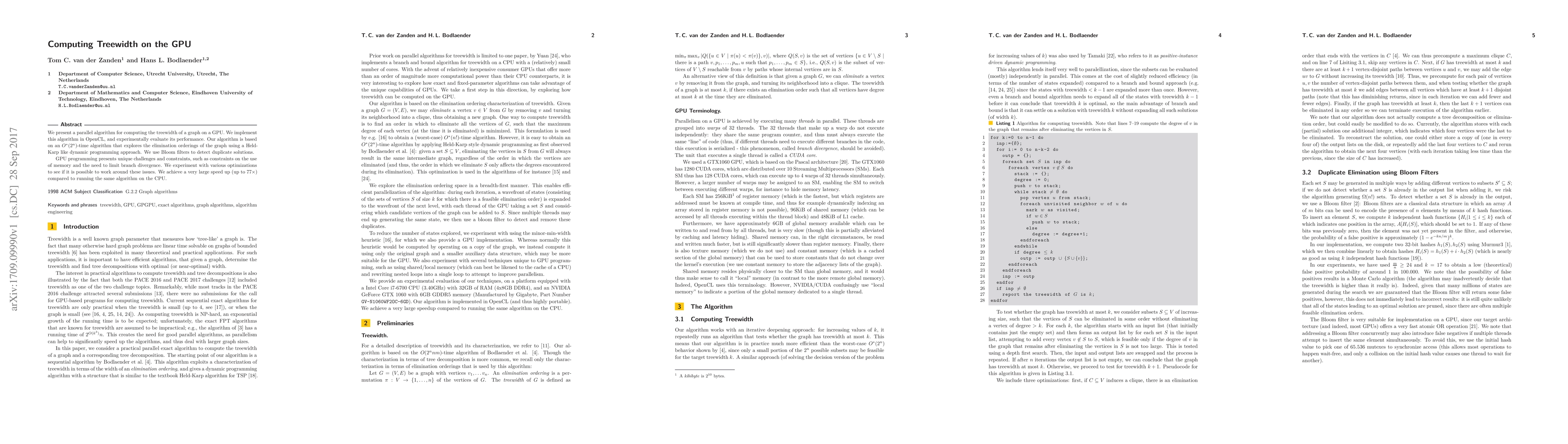 We present a parallel algorithm for computing the treewidth of a graph on a GPU. We implement this algorithm in OpenCL, and experimentally evaluate its performance. Our algorithm is based on an $O^*(2^{n})$-time algorithm that explores the elimination orderings of the graph using a Held-Karp like dynamic programming approach. We use Bloom filters to detect duplicate solutions. GPU programming presents unique challenges and constraints, such as constraints on the use of memory and the need to limit branch divergence. We experiment with various optimizations to see if it is possible to work around these issues. We achieve a very large speed up (up to $77\times$) compared to running the same algorithm on the CPU.