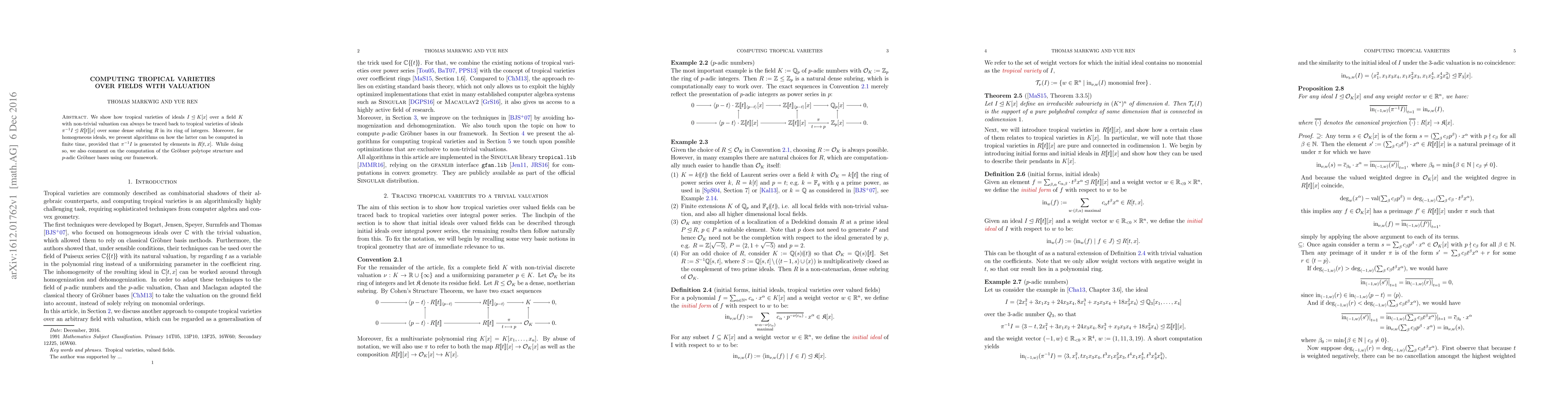 We show how tropical varieties of ideals I over a field K with non-trivial valuation can be traced back to tropical varieties of ideals in R[[t]][x] over some dense subring R in its ring of integers. Moreover, for homogeneous ideals, we present algorithms on how the latter can be computed in finite time, provided that generators are polynomial in t. While doing so, we also comment on the computation of the Groebner polytope structure and p-adic Groebner bases using our framework. All algorithms solely rely on existing standard basis techniques.