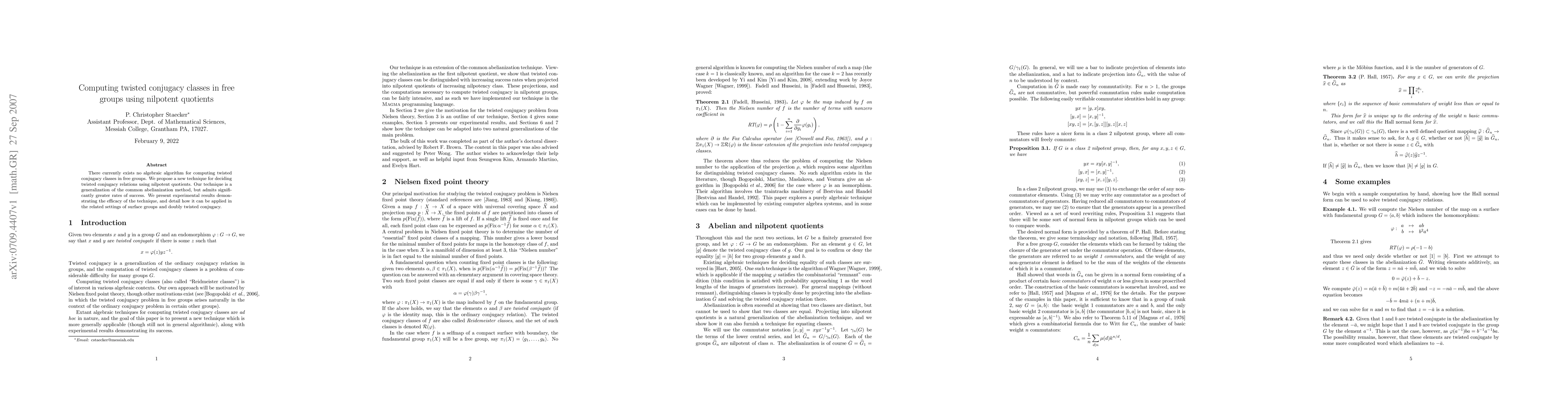 The paper proposes a novel technique for determining twisted conjugacy classes in free groups through the use of nilpotent quotients, offering a significant improvement over the traditional abelianization method. Experimental results showcase the technique's effectiveness and its applicability to surface groups and doubly twisted conjugacy.