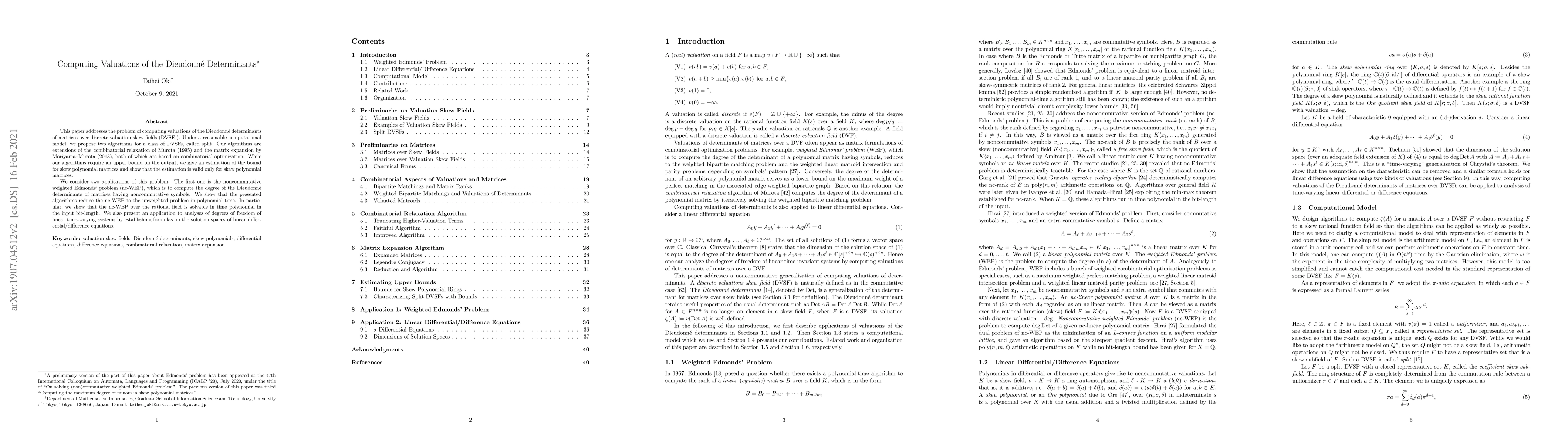 This paper proposes algorithms for computing valuations of Dieudonn\'e determinants in split discrete valuation skew fields, extending combinatorial optimization techniques. The algorithms solve the noncommutative weighted Edmonds' problem and analyze degrees of freedom in linear time-varying systems.