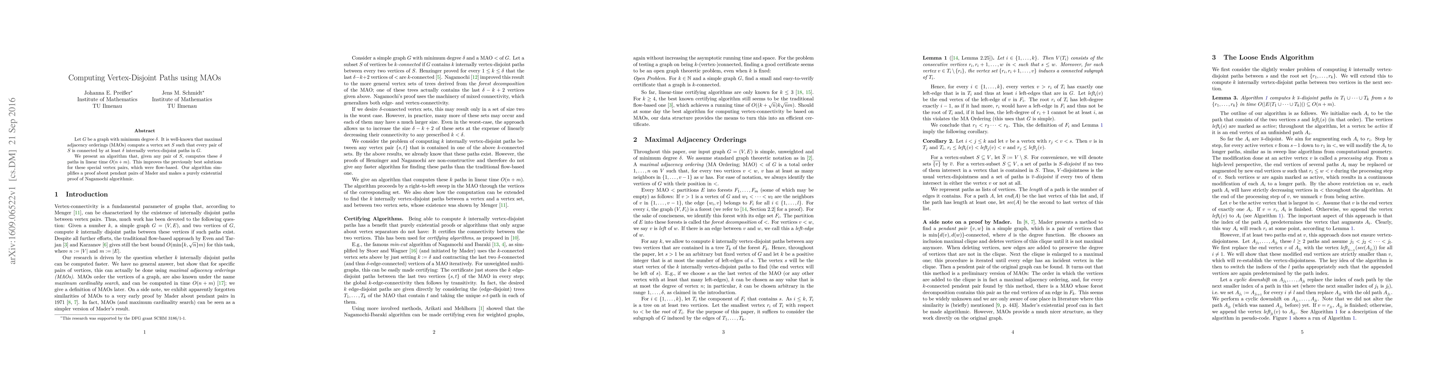 Let G be a graph with minimum degree $\delta$. It is well-known that maximal adjacency orderings (MAOs) compute a vertex set S such that every pair of S is connected by at least $\delta$ internally vertex-disjoint paths in G. We present an algorithm that, given any pair of S, computes these $\delta$ paths in linear time O(n+m). This improves the previously best solutions for these special vertex pairs, which were flow-based. Our algorithm simplifies a proof about pendant pairs of Mader and makes a purely existential proof of Nagamochi algorithmic.