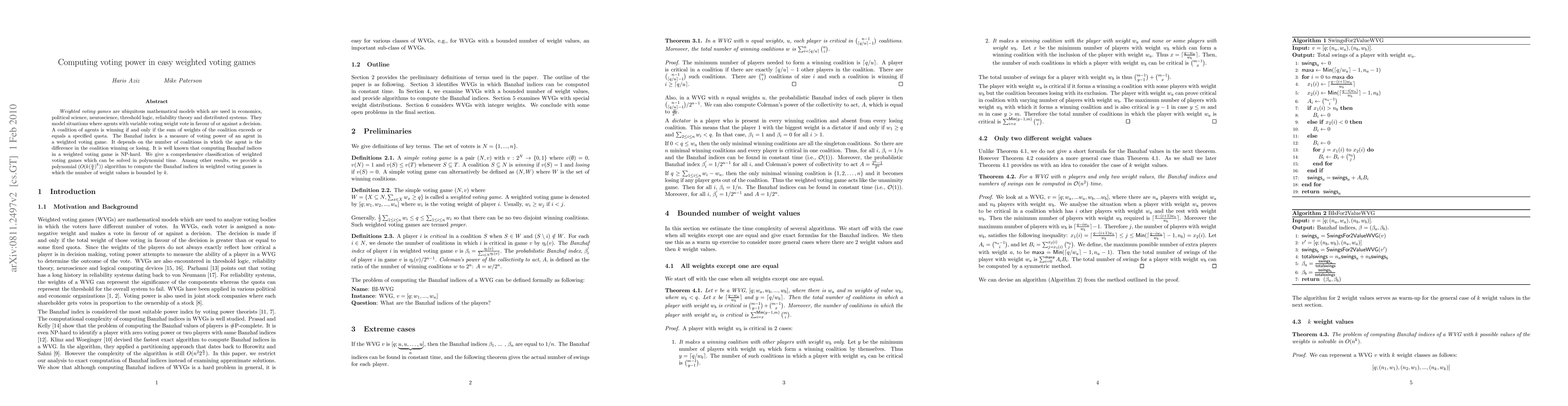 This paper classifies weighted voting games that can be solved in polynomial time and provides a polynomial algorithm to compute Banzhaf indices for games where the number of distinct weight values is limited. The Banzhaf index measures an agent's voting power based on the coalitions in which it can tip the balance.