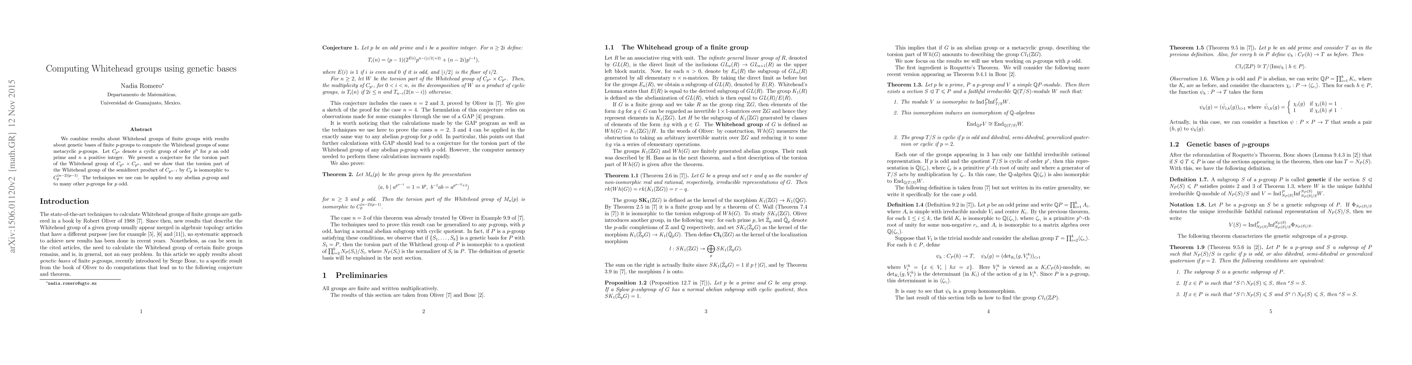 We combine results about Whitehead groups of finite groups with results about genetic bases of finite $p$-groups to compute the Whitehead groups of some metacyclic $p$-groups. Let $C_{p^n}$ denote a cyclic group of order $p^n$ for $p$ an odd prime and $n$ a positive integer. We present a conjecture for the torsion part of the Whitehead group of $C_{p^n}\times C_{p^n}$ and we show that torsion part of the Whitehead group of the semidirect product of $C_{p^{n-1}}$ by $C_p$ is isomorphic to $C_p^{(n-2)(p-1)}$. The techniques we use can be applied to any abelian $p$-group and to many other $p$-groups for $p$ odd.