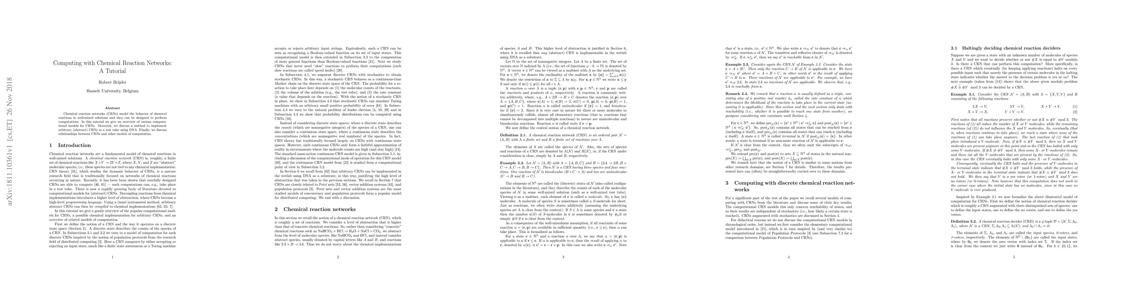Chemical reaction networks (CRNs) model the behavior of chemical reactions in well-mixed solutions and they can be designed to perform computations. In this tutorial we give an overview of various computational models for CRNs. Moreover, we discuss a method to implement arbitrary (abstract) CRNs in a test tube using DNA. Finally, we discuss relationships between CRNs and other models of computation.