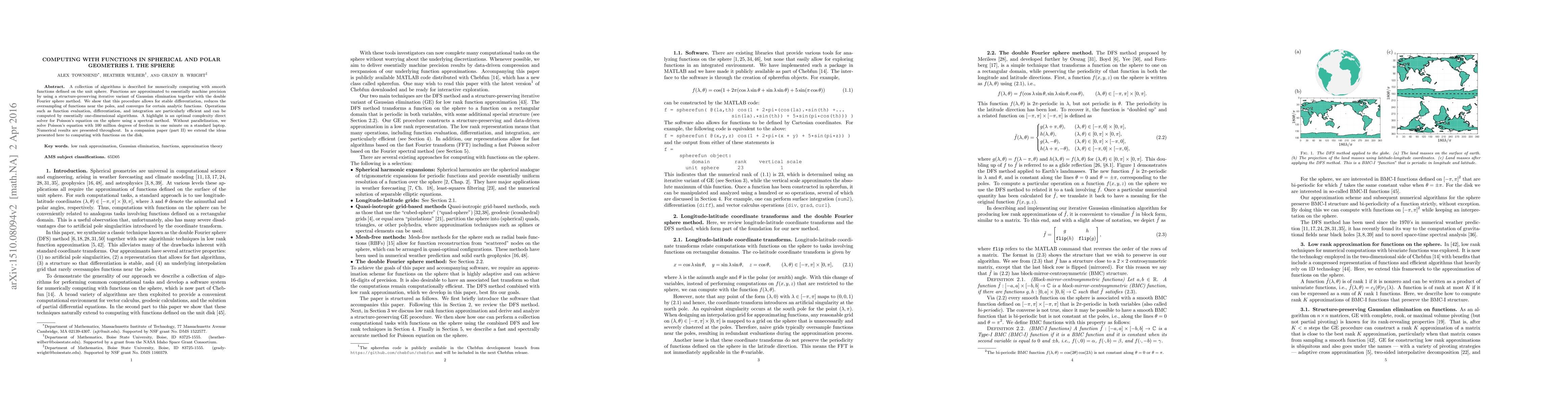 A collection of algorithms is described for numerically computing with smooth functions defined on the unit sphere. Functions are approximated to essentially machine precision by using a structure-preserving iterative variant of Gaussian elimination together with the double Fourier sphere method. We show that this procedure allows for stable differentiation, reduces the oversampling of functions near the poles, and converges for certain analytic functions. Operations such as function evaluation, differentiation, and integration are particularly efficient and can be computed by essentially one-dimensional algorithms. A highlight is an optimal complexity direct solver for Poisson's equation on the sphere using a spectral method. Without parallelization, we solve Poisson's equation with $100$ million degrees of freedom in one minute on a standard laptop. Numerical results are presented throughout. In a companion paper (part II) we extend the ideas presented here to computing with functions on the disk.