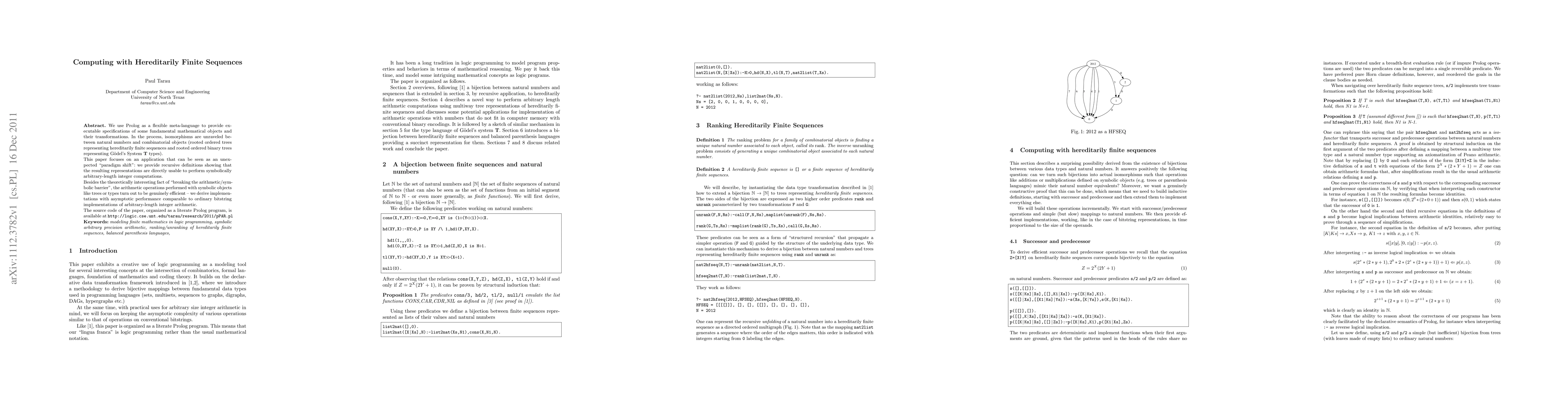 e use Prolog as a flexible meta-language to provide executable specifications of some fundamental mathematical objects and their transformations. In the process, isomorphisms are unraveled between natural numbers and combinatorial objects (rooted ordered trees representing hereditarily finite sequences and rooted ordered binary trees representing G\"odel's System {\bf T} types). This paper focuses on an application that can be seen as an unexpected "paradigm shift": we provide recursive definitions showing that the resulting representations are directly usable to perform symbolically arbitrary-length integer computations. Besides the theoretically interesting fact of "breaking the arithmetic/symbolic barrier", the arithmetic operations performed with symbolic objects like trees or types turn out to be genuinely efficient -- we derive implementations with asymptotic performance comparable to ordinary bitstring implementations of arbitrary-length integer arithmetic. The source code of the paper, organized as a literate Prolog program, is available at \url{http://logic.cse.unt.edu/tarau/research/2011/pPAR.pl}