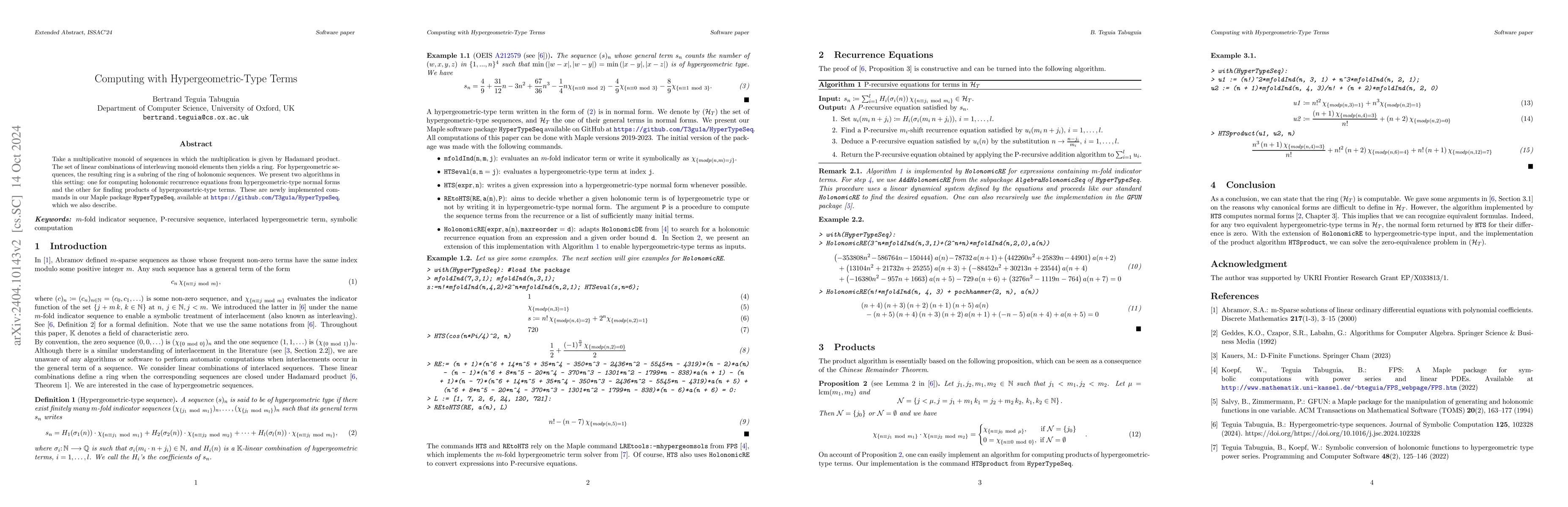 Take a multiplicative monoid of sequences in which the multiplication is given by Hadamard product. The set of linear combinations of interleaving monoid elements then yields a ring. We consider such a construction for the monoid of hypergeometric sequences, yielding what we call the ring of hypergeometric-type sequences -- a subring of the ring of holonomic sequences. We present two algorithms in this setting: one for computing holonomic recurrence equations from hypergeometric-type normal forms and the other for finding products of hypergeometric-type terms. These are newly implemented commands in our Maple package $\texttt{HyperTypeSeq}$, which we also describe.