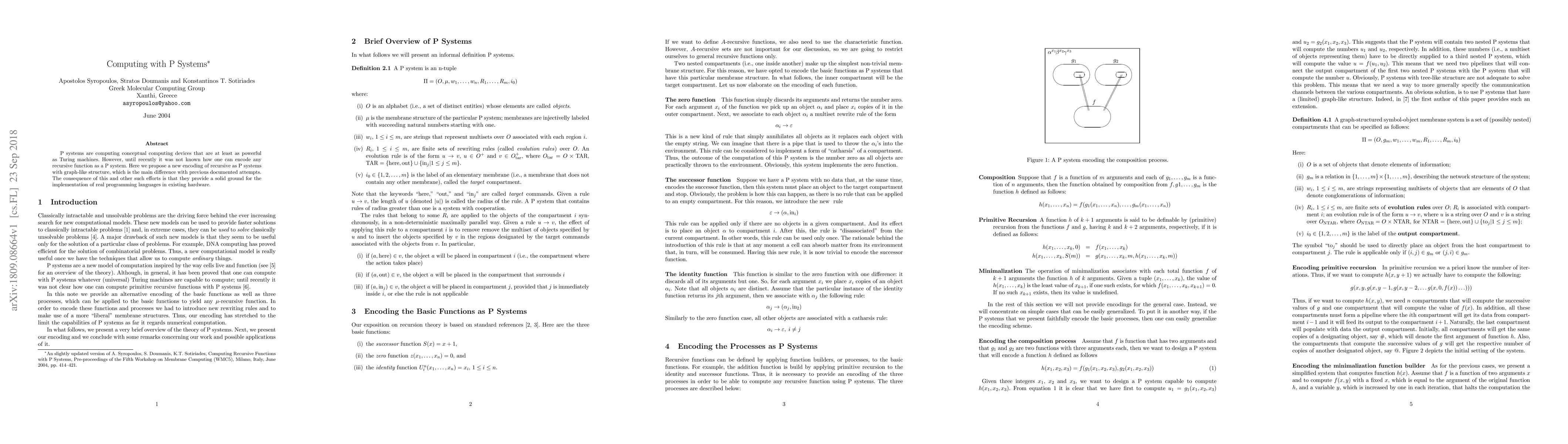 P systems are computing conceptual computing devices that are at least as powerful as Turing machines. However, until recently it was not known how one can encode any recursive function as a P~system. Here we propose a new encoding of recursive as P~systems with graph-like structure, which is the main difference with previous documented attempts. The consequence of this and other such efforts is that they provide a solid ground for the implementation of real programming languages in existing hardware.