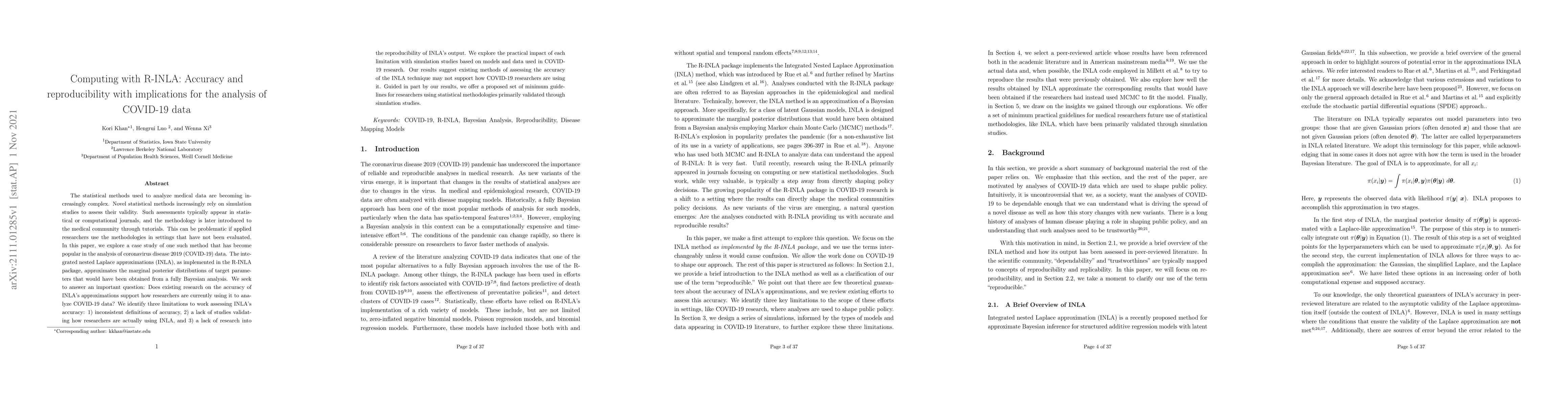 The statistical methods used to analyze medical data are becoming increasingly complex. Novel statistical methods increasingly rely on simulation studies to assess their validity. Such assessments typically appear in statistical or computational journals, and the methodology is later introduced to the medical community through tutorials. This can be problematic if applied researchers use the methodologies in settings that have not been evaluated. In this paper, we explore a case study of one such method that has become popular in the analysis of coronavirus disease 2019 (COVID-19) data. The integrated nested Laplace approximations (INLA), as implemented in the R-INLA package, approximates the marginal posterior distributions of target parameters that would have been obtained from a fully Bayesian analysis. We seek to answer an important question: Does existing research on the accuracy of INLA's approximations support how researchers are currently using it to analyze COVID-19 data? We identify three limitations to work assessing INLA's accuracy: 1) inconsistent definitions of accuracy, 2) a lack of studies validating how researchers are actually using INLA, and 3) a lack of research into the reproducibility of INLA's output. We explore the practical impact of each limitation with simulation studies based on models and data used in COVID-19 research. Our results suggest existing methods of assessing the accuracy of the INLA technique may not support how COVID-19 researchers are using it. Guided in part by our results, we offer a proposed set of minimum guidelines for researchers using statistical methodologies primarily validated through simulation studies.