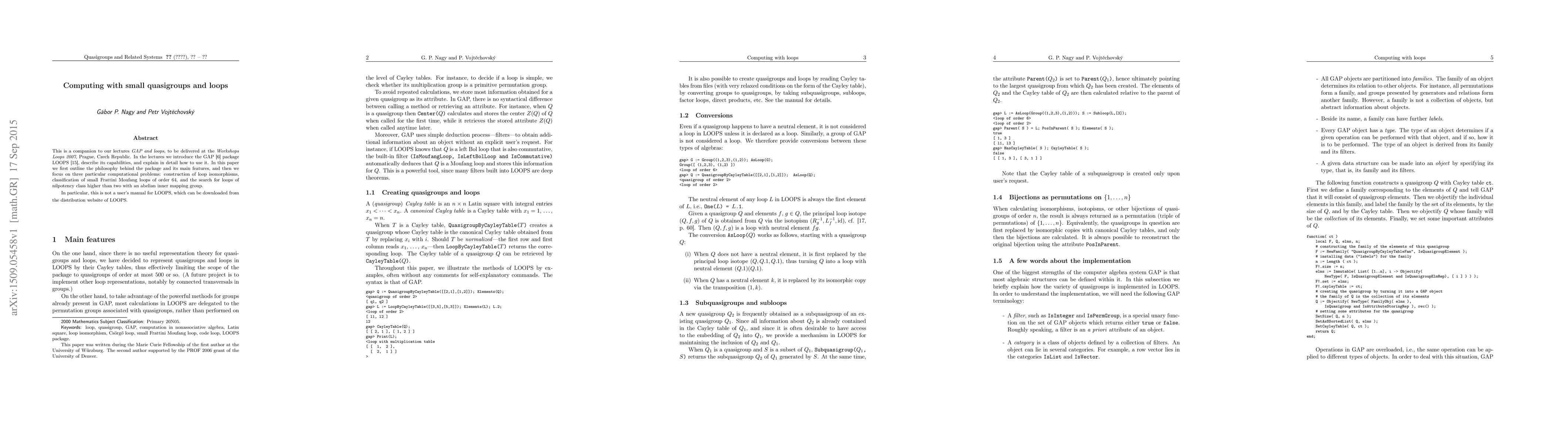 This is a companion to our lectures GAP and loops, to be delivered at the Workshops Loops 2007, Prague, Czech Republic. In the lectures we introduce the GAP package LOOPS, describe its capabilities, and explain in detail how to use it. In this paper we first outline the philosophy behind the package and its main features, and then we focus on three particular computational problems: construction of loop isomorphisms, classification of small Frattini Moufang loops of order 64, and the search for loops of nilpotency class higher than two with an abelian inner mapping group. In particular, this is not a user's manual for LOOPS, which can be downloaded from the distribution website of LOOPS.