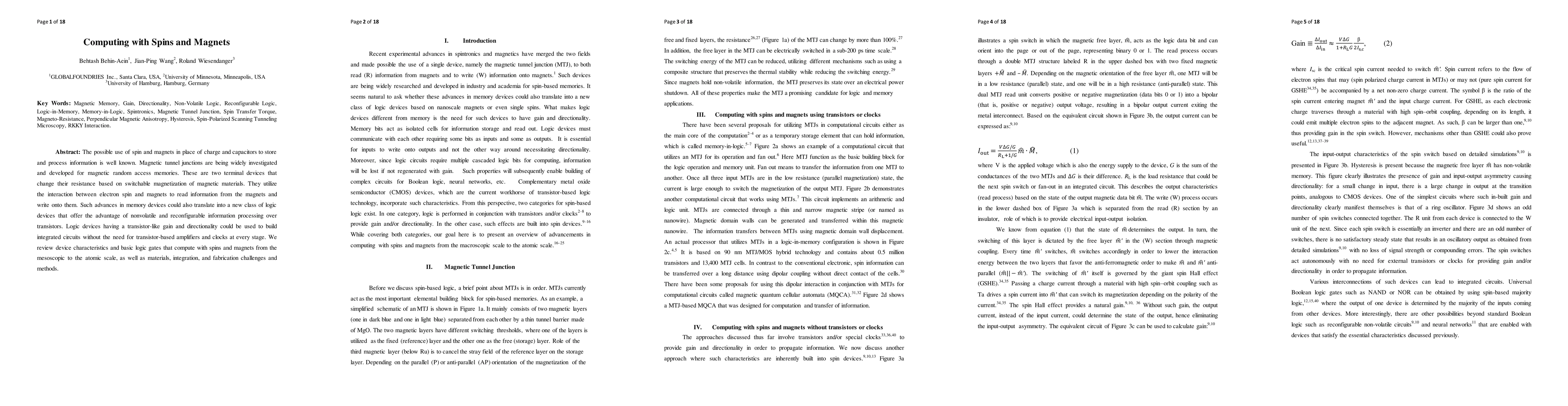 This paper explores the potential of spin and magnetic materials to replace charge-based systems for information storage and processing. It reviews magnetic tunnel junctions and their use in nonvolatile memory devices, highlighting the advantages of spin-based logic over traditional transistors, and discusses the challenges and methods for integrating these devices at various scales.