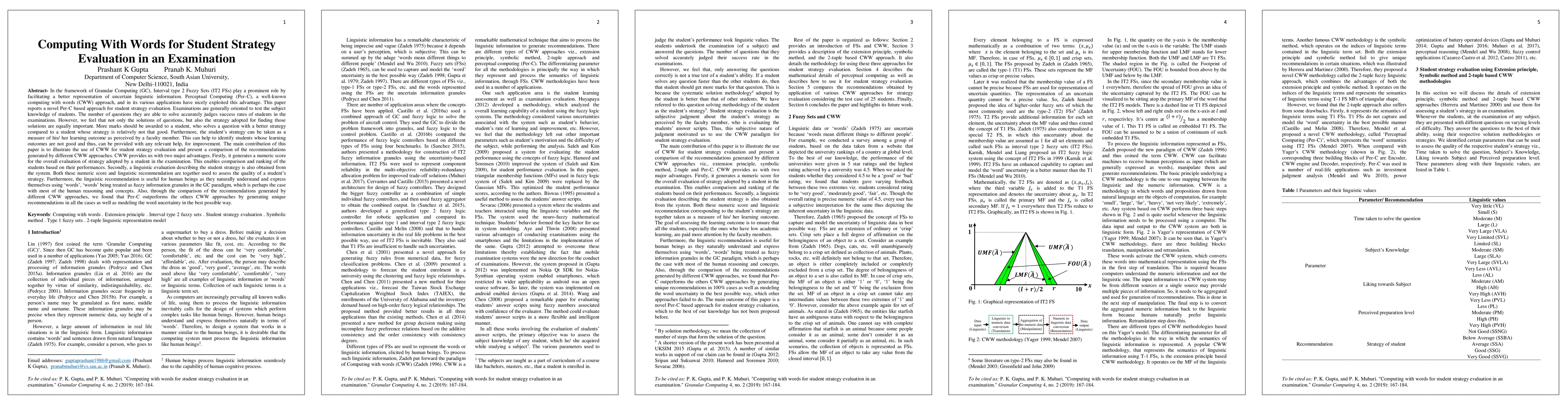 In the framework of Granular Computing (GC), Interval type 2 Fuzzy Sets (IT2 FSs) play a prominent role by facilitating a better representation of uncertain linguistic information. Perceptual Computing (Per C), a well known computing with words (CWW) approach, and its various applications have nicely exploited this advantage. This paper reports a novel Per C based approach for student strategy evaluation. Examinations are generally oriented to test the subject knowledge of students. The number of questions that they are able to solve accurately judges success rates of students in the examinations. However, we feel that not only the solutions of questions, but also the strategy adopted for finding those solutions are equally important. More marks should be awarded to a student, who solves a question with a better strategy compared to a student, whose strategy is relatively not that good. Furthermore, the students strategy can be taken as a measure of his or her learning outcome as perceived by a faculty member. This can help to identify students, whose learning outcomes are not good, and, thus, can be provided with any relevant help, for improvement. The main contribution of this paper is to illustrate the use of CWW for student strategy evaluation and present a comparison of the recommendations generated by different CWW approaches. CWW provides us with two major advantages. First, it generates a numeric score for the overall evaluation of strategy adopted by a student in the examination. This enables comparison and ranking of the students based on their performances. Second, a linguistic evaluation describing the student strategy is also obtained from the system. Both these numeric score and linguistic recommendation are together used to assess the quality of a students strategy. We found that Per-C generates unique recommendations in all cases and outperforms other CWW approaches.